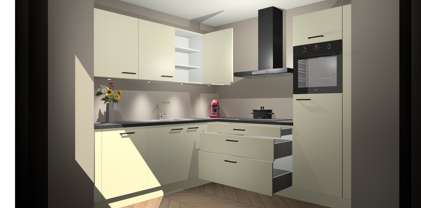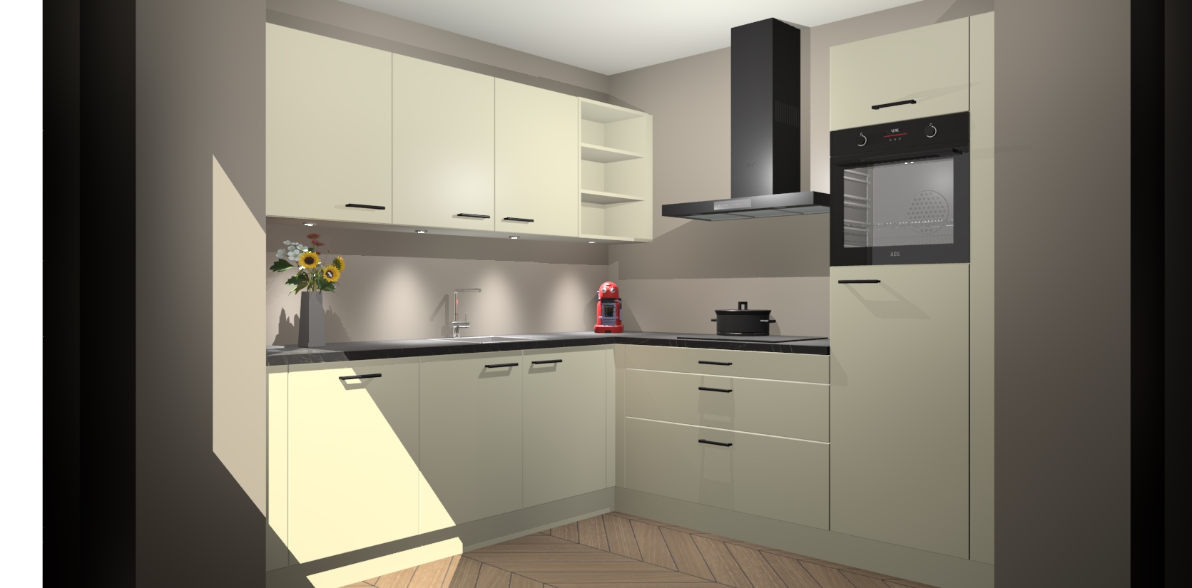 Met een modern, tijdloos design en ruime opslagruimte, zult u zich in no-time thuis voelen in uw nieuwe keuken. Uw leven wordt eenvoudiger met de soft-close deuren die voor het ultieme stille comfort zorgen - geen geluid dat u stoort terwijl u kookt. Ook is de keuken voorzien van 5 ingebouwde apparaten: een oven, inductie kookplaat, afzuigkap, vaatwasser en koelkast. Deze kunnen gemakkelijk na bestelling worden bijgewerkt naar AEG - waardoor uw luxe ervaring compleet is.