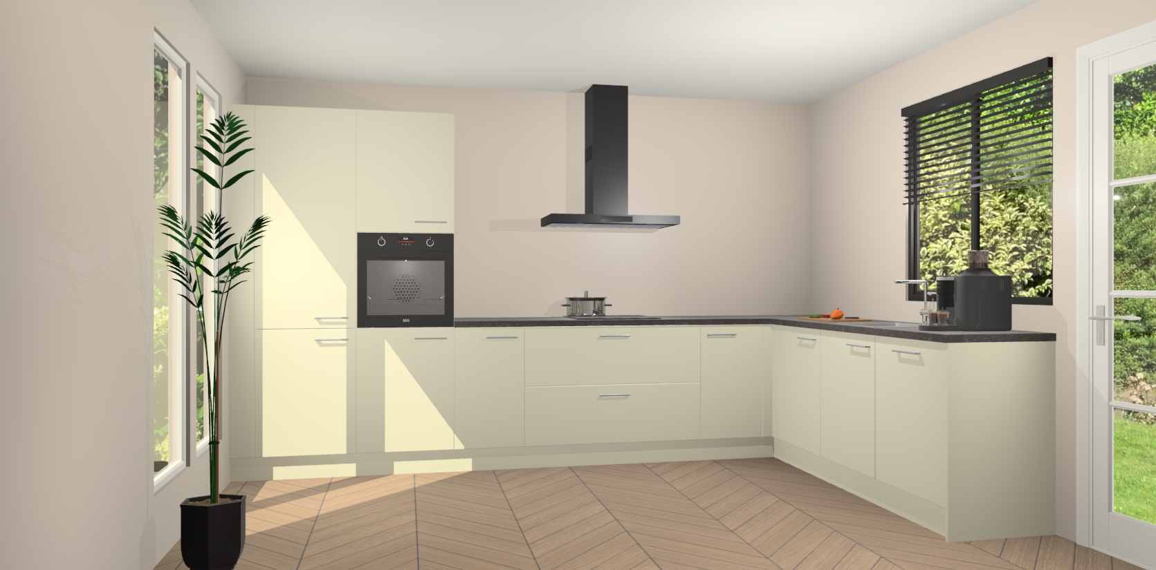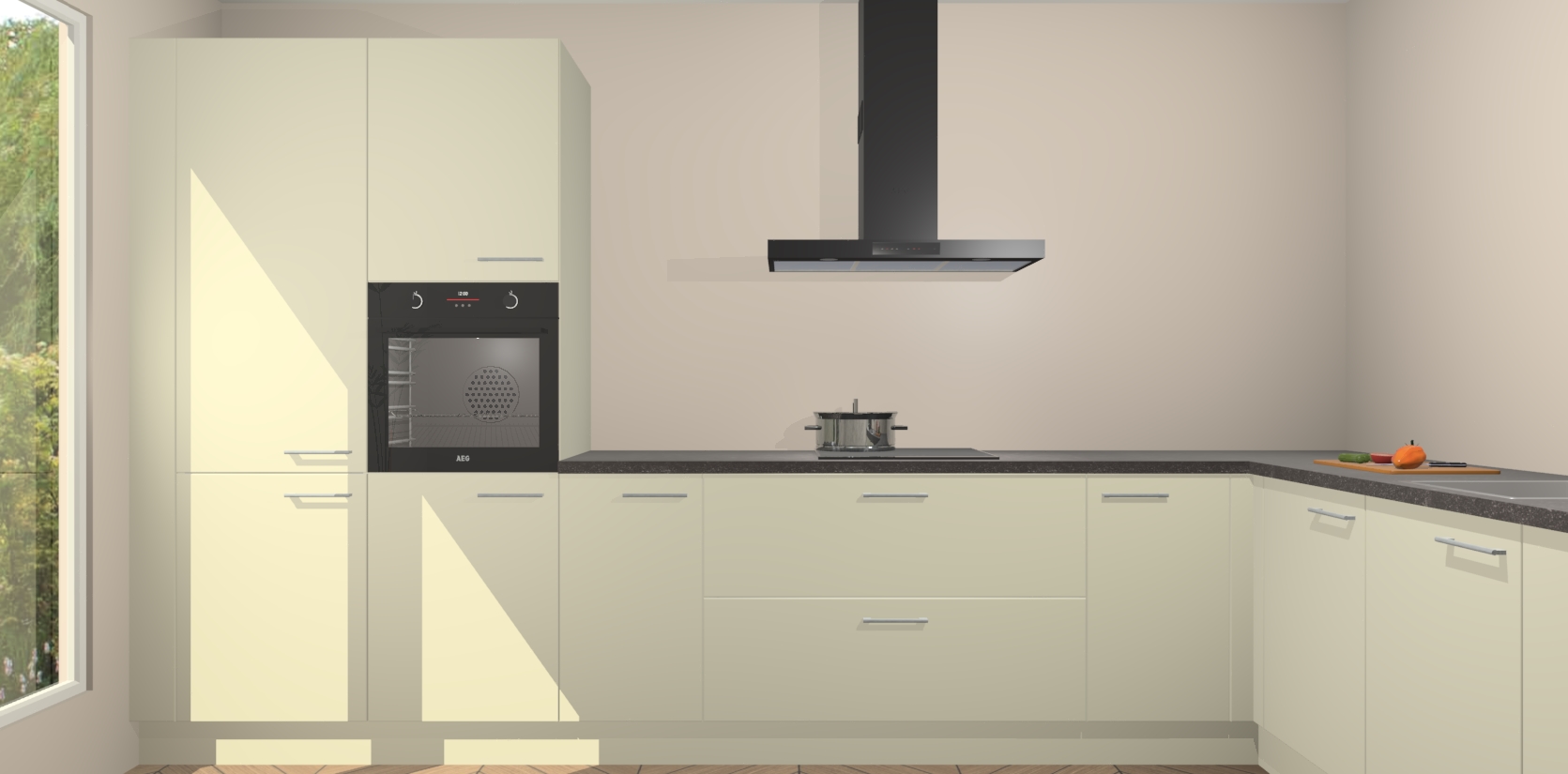 Met een modern, tijdloos design en ruime opslagruimte, zult u zich in no-time thuis voelen in uw nieuwe keuken. Uw leven wordt eenvoudiger met de soft-close deuren die voor het ultieme stille comfort zorgen - geen geluid dat u stoort terwijl u kookt. Ook is de keuken voorzien van 5 ingebouwde apparaten: een oven, inductie kookplaat, afzuigkap, vaatwasser en koelkast. Deze kunnen gemakkelijk na bestelling worden bijgewerkt naar AEG - waardoor uw luxe ervaring compleet is.