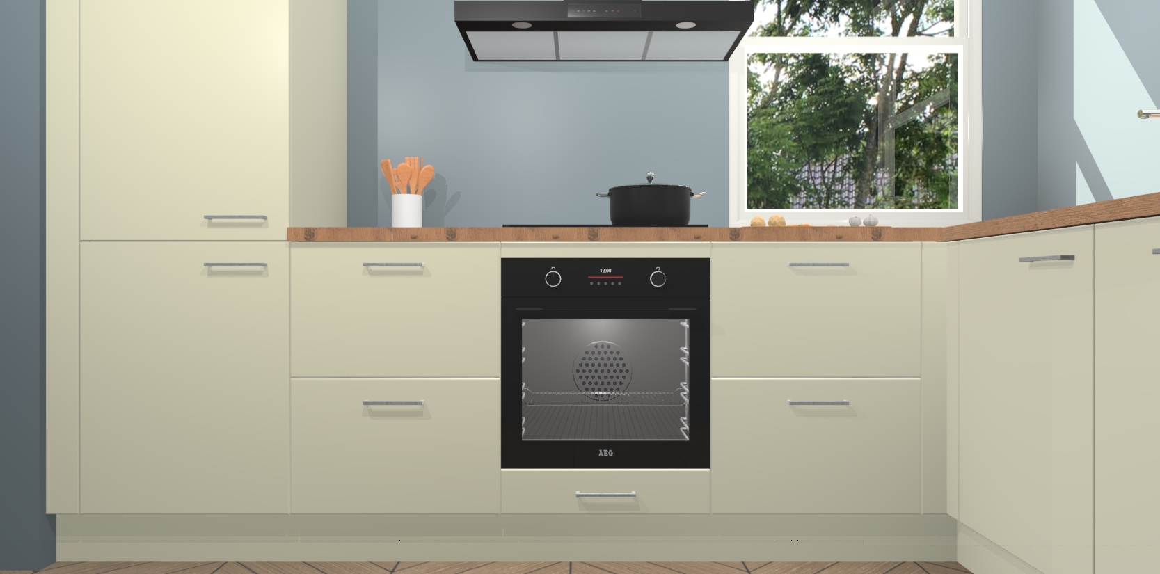 Wat maakt deze keuken zo bijzonder? Ten eerste geeft het houten werkblad uw ruimte een onmiskenbaar klassieke uitstraling. De natuurlijke afwerking roept warmte en elegantie op die nooit uit de mode zullen raken. Bovendien is het gemakkelijk schoon te houden en te onderhouden, zodat je er jarenlang plezier van kunt hebben. Als u op zoek bent naar extra gemak in uw keuken, dan heeft u bij het plaatsen van een bestelling bij ons ook de optie om uw toestellen te upgraden naar AEG-modellen - zo haalt u moderne innovatie van topmerken in apparatentechnologie rechtstreeks in huis.