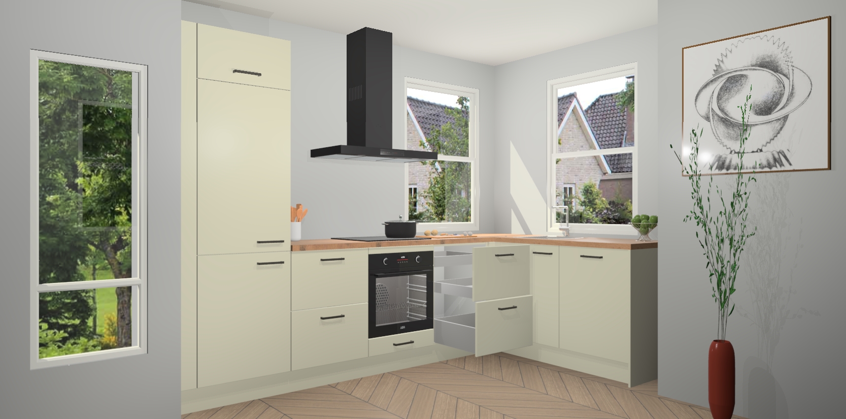 Wat maakt deze keuken zo bijzonder? Ten eerste geeft het houten werkblad uw ruimte een onmiskenbaar klassieke uitstraling. De natuurlijke afwerking roept warmte en elegantie op die nooit uit de mode zullen raken. Bovendien is het gemakkelijk schoon te houden en te onderhouden, zodat je er jarenlang plezier van kunt hebben. Als u op zoek bent naar extra gemak in uw keuken, dan heeft u bij het plaatsen van een bestelling bij ons ook de optie om uw toestellen te upgraden naar AEG-modellen - zo haalt u moderne innovatie van topmerken in apparatentechnologie rechtstreeks in huis.
