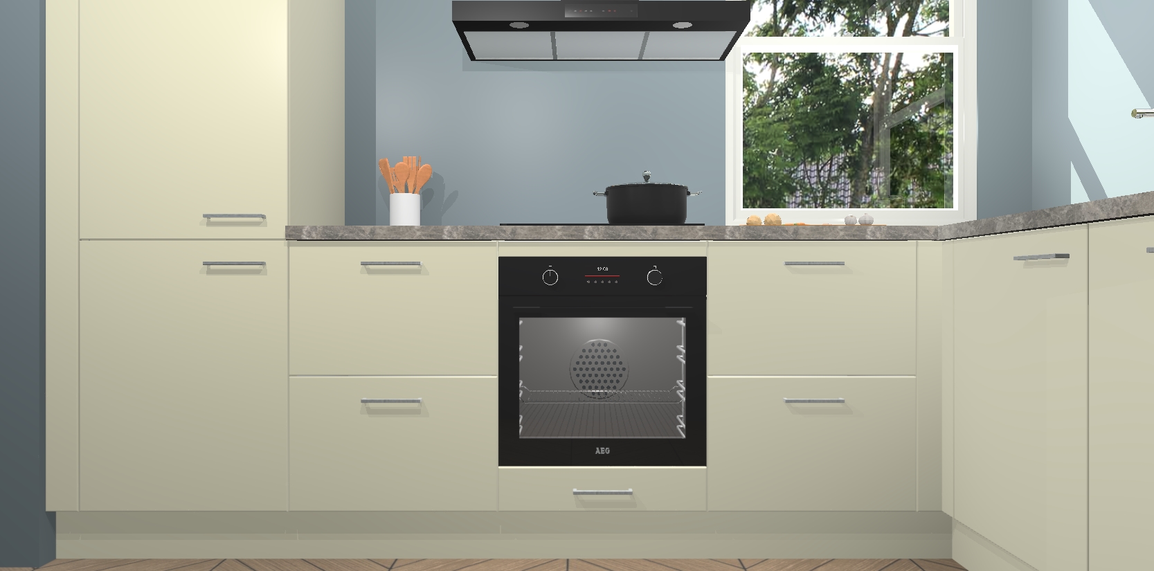 Wat maakt deze keuken zo bijzonder? Ten eerste geeft het houten werkblad uw ruimte een onmiskenbaar klassieke uitstraling. De natuurlijke afwerking roept warmte en elegantie op die nooit uit de mode zullen raken. Bovendien is het gemakkelijk schoon te houden en te onderhouden, zodat je er jarenlang plezier van kunt hebben. Als u op zoek bent naar extra gemak in uw keuken, dan heeft u bij het plaatsen van een bestelling bij ons ook de optie om uw toestellen te upgraden naar AEG-modellen - zo haalt u moderne innovatie van topmerken in apparatentechnologie rechtstreeks in huis.
