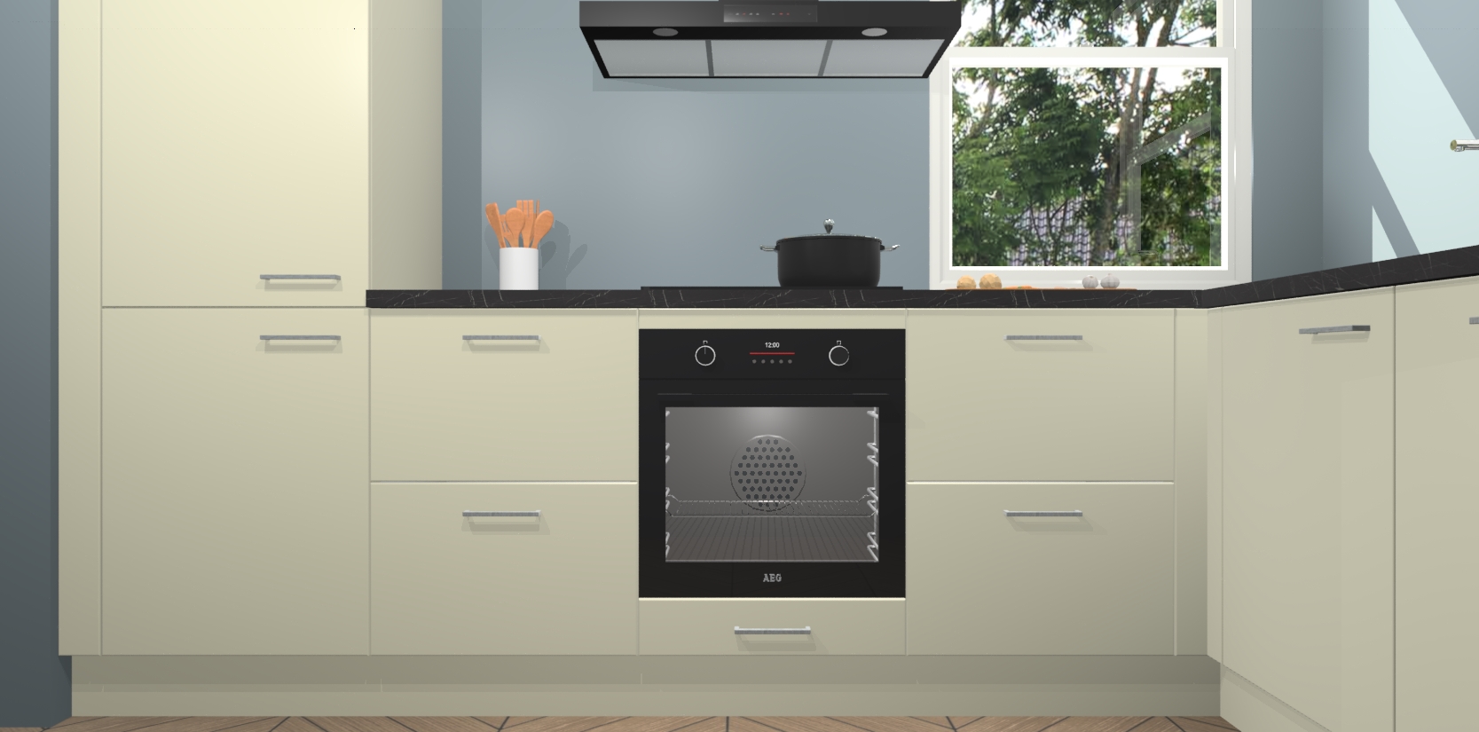 Wat maakt deze keuken zo bijzonder? Ten eerste geeft het houten werkblad uw ruimte een onmiskenbaar klassieke uitstraling. De natuurlijke afwerking roept warmte en elegantie op die nooit uit de mode zullen raken. Bovendien is het gemakkelijk schoon te houden en te onderhouden, zodat je er jarenlang plezier van kunt hebben. Als u op zoek bent naar extra gemak in uw keuken, dan heeft u bij het plaatsen van een bestelling bij ons ook de optie om uw toestellen te upgraden naar AEG-modellen - zo haalt u moderne innovatie van topmerken in apparatentechnologie rechtstreeks in huis.