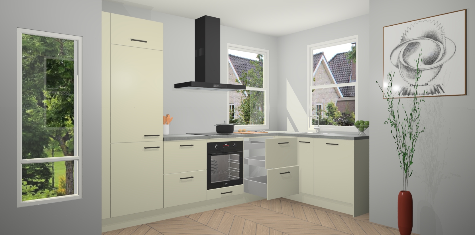 Wat maakt deze keuken zo bijzonder? Ten eerste geeft het houten werkblad uw ruimte een onmiskenbaar klassieke uitstraling. De natuurlijke afwerking roept warmte en elegantie op die nooit uit de mode zullen raken. Bovendien is het gemakkelijk schoon te houden en te onderhouden, zodat je er jarenlang plezier van kunt hebben. Als u op zoek bent naar extra gemak in uw keuken, dan heeft u bij het plaatsen van een bestelling bij ons ook de optie om uw toestellen te upgraden naar AEG-modellen - zo haalt u moderne innovatie van topmerken in apparatentechnologie rechtstreeks in huis.