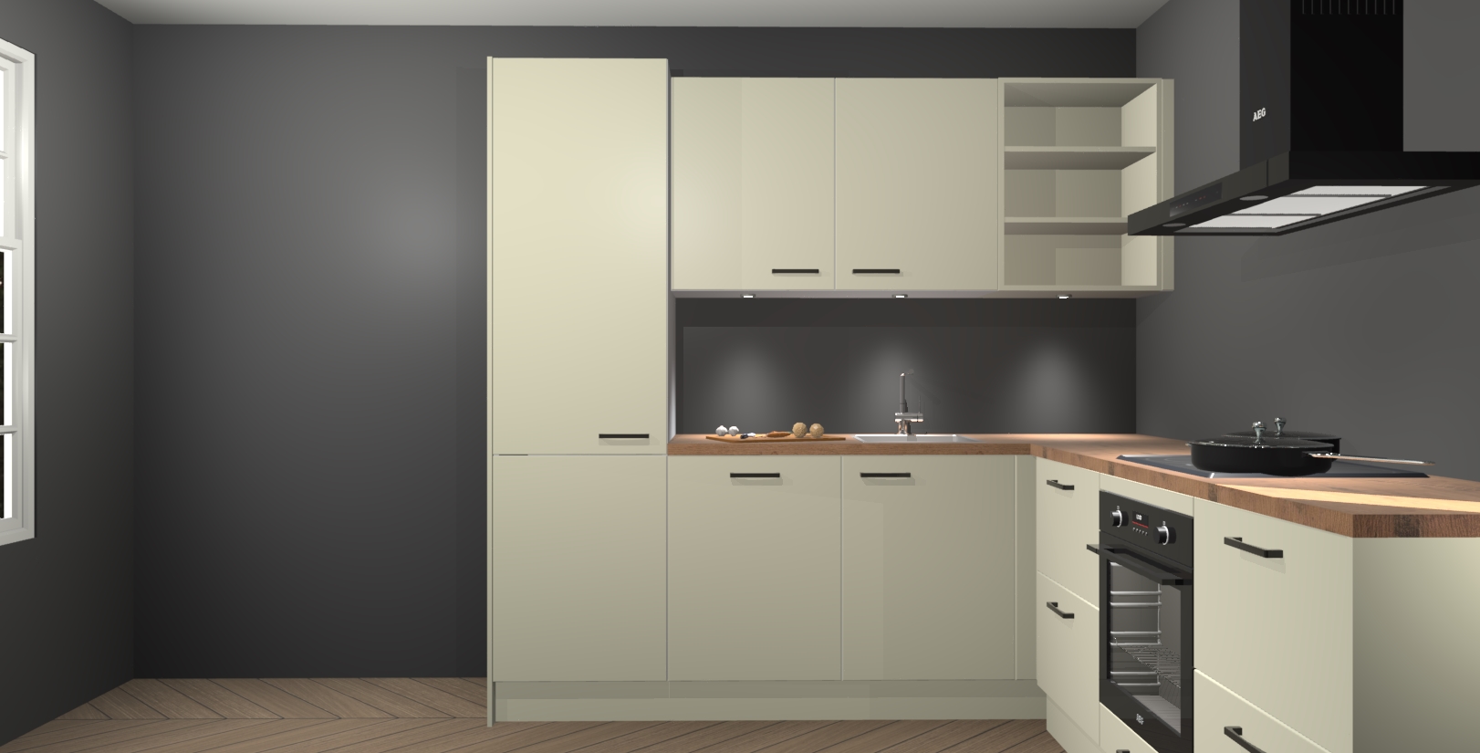 Met zijn moderne design en aantrekkelijke hoekopstelling biedt deze keuken een unieke look die zelfs de meest veeleisende huiseigenaar zal bevallen. En omdat de binnenkant van de kasten dezelfde kleur heeft als de buitenkant, heeft uw keuken een consistente afwerking. Bovenop de geweldige look is opbergruimte ook geen probleem, met voldoende kast- en laderuimte achter zelfs de mooiste buitenkant.