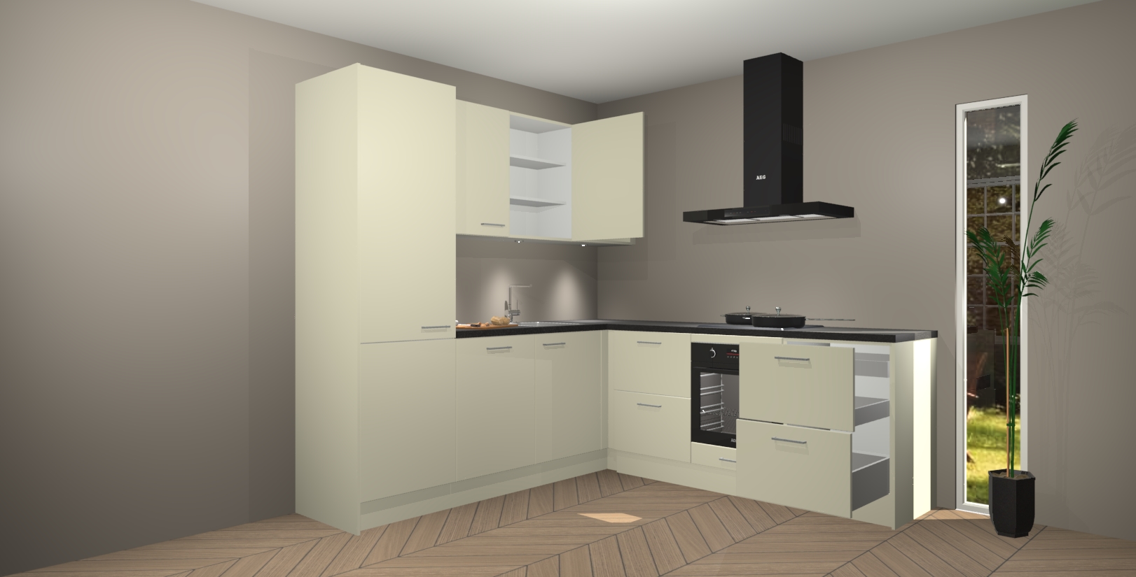 Met zijn moderne design en aantrekkelijke hoekopstelling biedt deze keuken een unieke look die zelfs de meest veeleisende huiseigenaar zal bevallen. En omdat de binnenkant van de kasten dezelfde kleur heeft als de buitenkant, heeft uw keuken een consistente afwerking. Bovenop de geweldige look is opbergruimte ook geen probleem, met voldoende kast- en laderuimte achter zelfs de mooiste buitenkant.