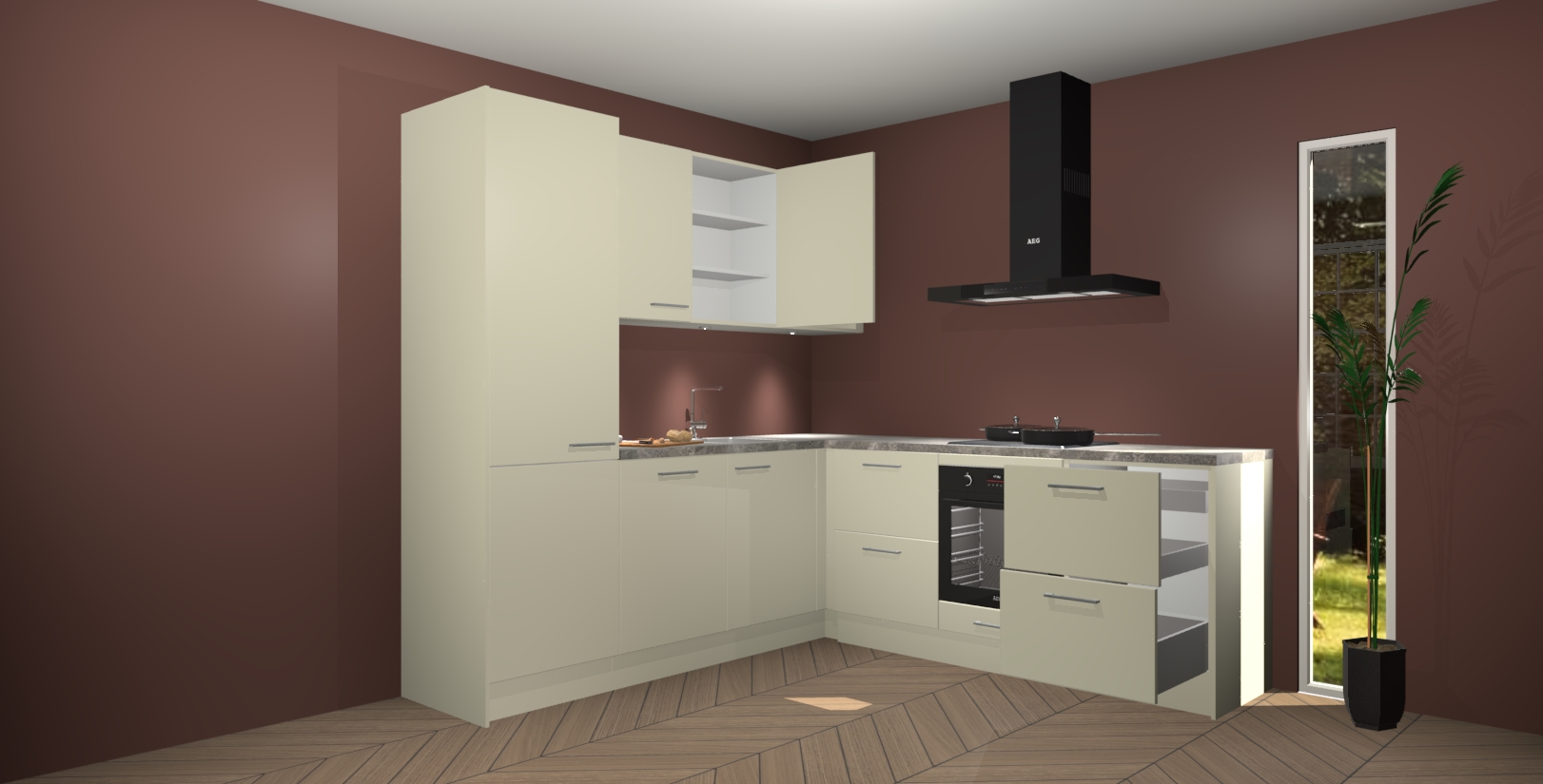 Met zijn moderne design en aantrekkelijke hoekopstelling biedt deze keuken een unieke look die zelfs de meest veeleisende huiseigenaar zal bevallen. En omdat de binnenkant van de kasten dezelfde kleur heeft als de buitenkant, heeft uw keuken een consistente afwerking. Bovenop de geweldige look is opbergruimte ook geen probleem, met voldoende kast- en laderuimte achter zelfs de mooiste buitenkant.