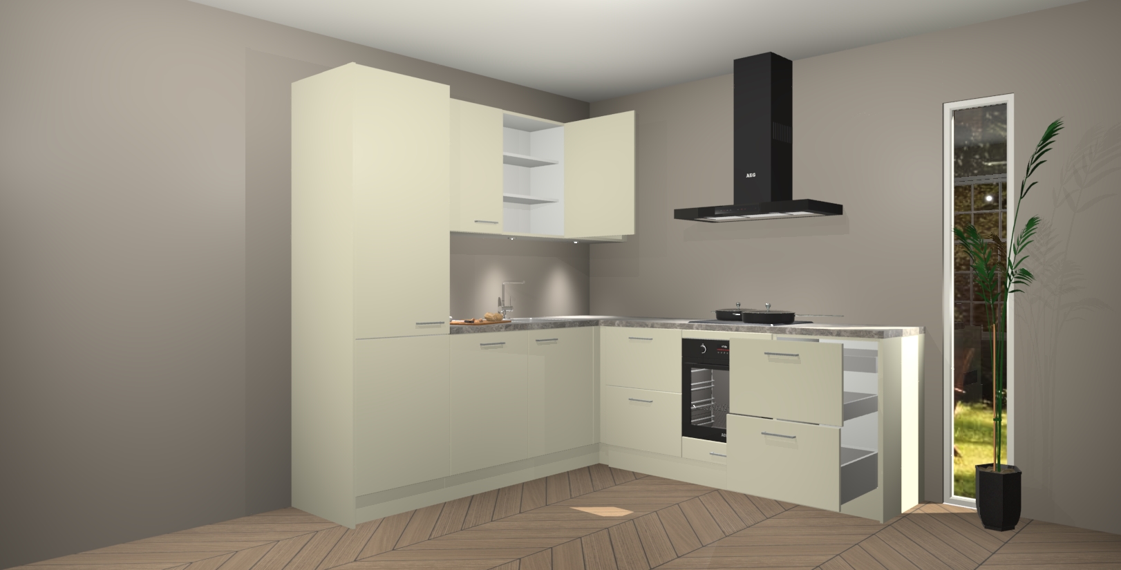 Met zijn moderne design en aantrekkelijke hoekopstelling biedt deze keuken een unieke look die zelfs de meest veeleisende huiseigenaar zal bevallen. En omdat de binnenkant van de kasten dezelfde kleur heeft als de buitenkant, heeft uw keuken een consistente afwerking. Bovenop de geweldige look is opbergruimte ook geen probleem, met voldoende kast- en laderuimte achter zelfs de mooiste buitenkant.