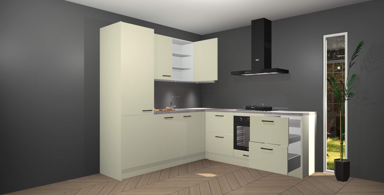 Met zijn moderne design en aantrekkelijke hoekopstelling biedt deze keuken een unieke look die zelfs de meest veeleisende huiseigenaar zal bevallen. En omdat de binnenkant van de kasten dezelfde kleur heeft als de buitenkant, heeft uw keuken een consistente afwerking. Bovenop de geweldige look is opbergruimte ook geen probleem, met voldoende kast- en laderuimte achter zelfs de mooiste buitenkant.