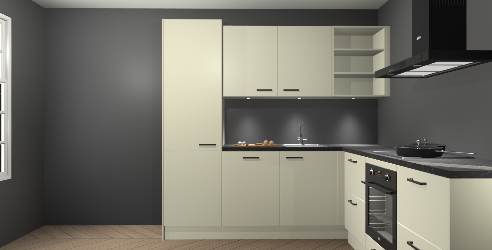 Met zijn moderne design en aantrekkelijke hoekopstelling biedt deze keuken een unieke look die zelfs de meest veeleisende huiseigenaar zal bevallen. En omdat de binnenkant van de kasten dezelfde kleur heeft als de buitenkant, heeft uw keuken een consistente afwerking. Bovenop de geweldige look is opbergruimte ook geen probleem, met voldoende kast- en laderuimte achter zelfs de mooiste buitenkant.