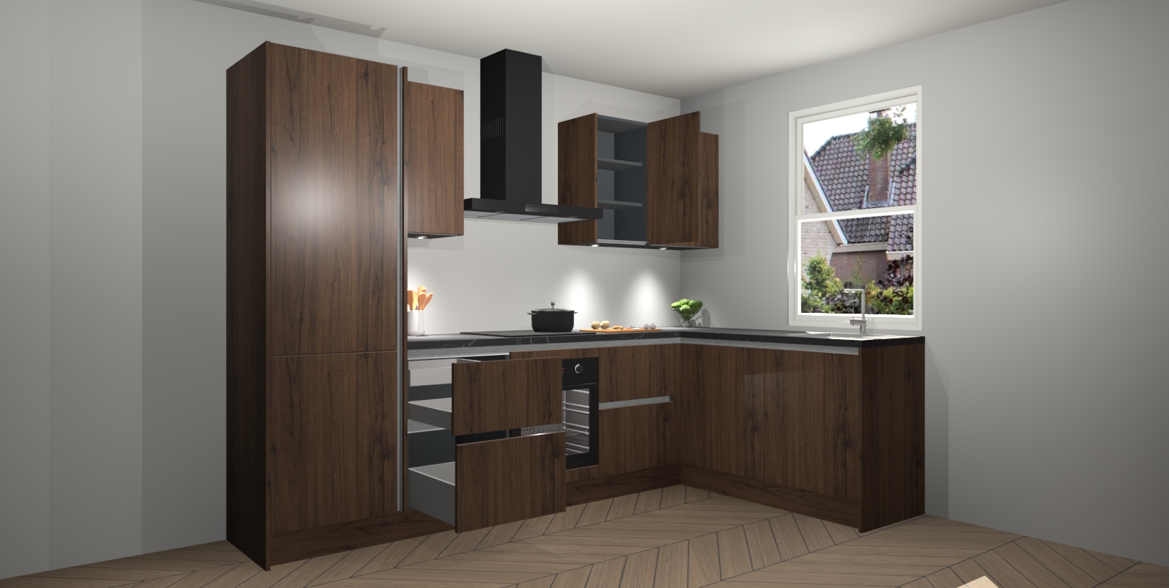 Maak kennis met de trendsettende en luxe Noten greeploze keuken Bazel! Deze uitzonderlijke keuken van Duitse kwaliteit is stijlvol, modern en perfect om elk huis mee op te fleuren. De binnenkant van de kasten worden meegenomen in een bijpassende kleur om een samenhangende eigentijdse esthetiek te voltooien. U zult dol zijn op hoe uw pas gerenoveerde keuken eruitziet met de Noten editie!