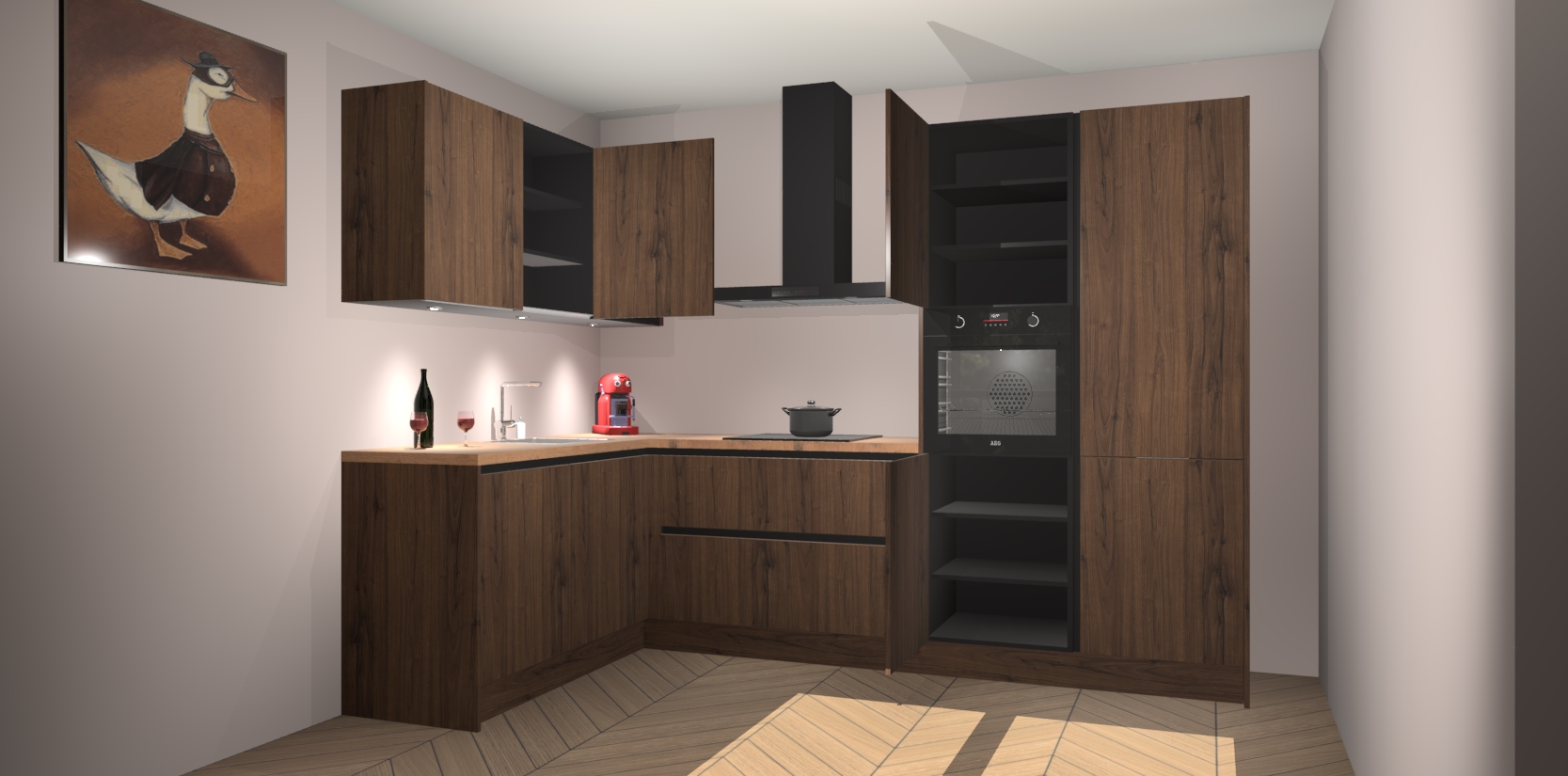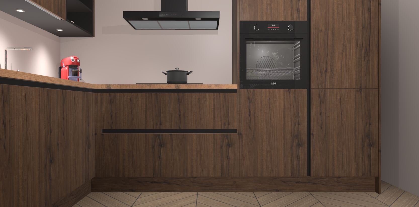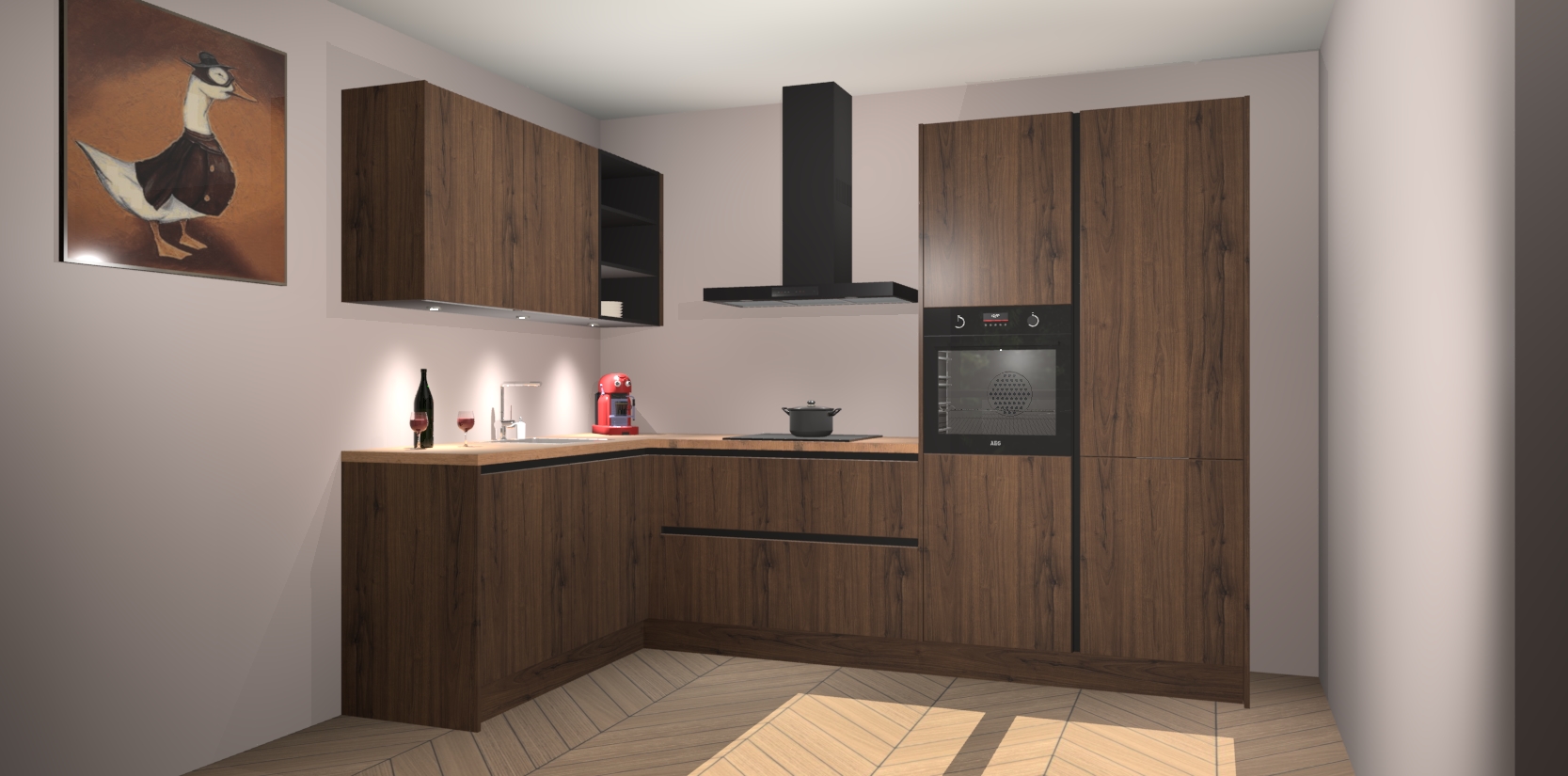 De Noten greeploze keuken Cognac is een adembenemend ontwerp met een modern en tijdloos uiterlijk. Deze luxe keuken straalt echt aristocratisch uit, waardoor uw koken plezieriger zal worden! Het prachtige design begint bij de hoekkeuken, wat perfect past bij elk type interieur. Bovendien bevat deze hoogwaardige set vijf inbouwapparaten - van oven tot koelkast - die via bestelling naar AEG geüpgraded kunnen worden!