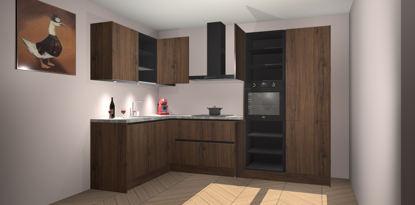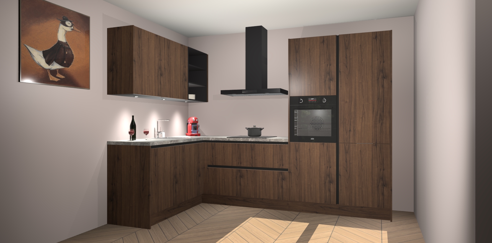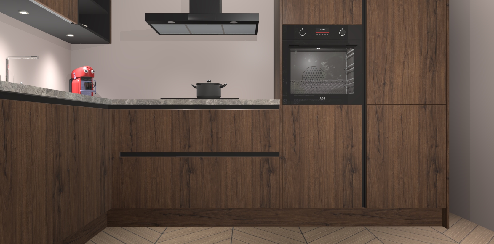De Noten greeploze keuken Cognac is een adembenemend ontwerp met een modern en tijdloos uiterlijk. Deze luxe keuken straalt echt aristocratisch uit, waardoor uw koken plezieriger zal worden! Het prachtige design begint bij de hoekkeuken, wat perfect past bij elk type interieur. Bovendien bevat deze hoogwaardige set vijf inbouwapparaten - van oven tot koelkast - die via bestelling naar AEG geüpgraded kunnen worden!