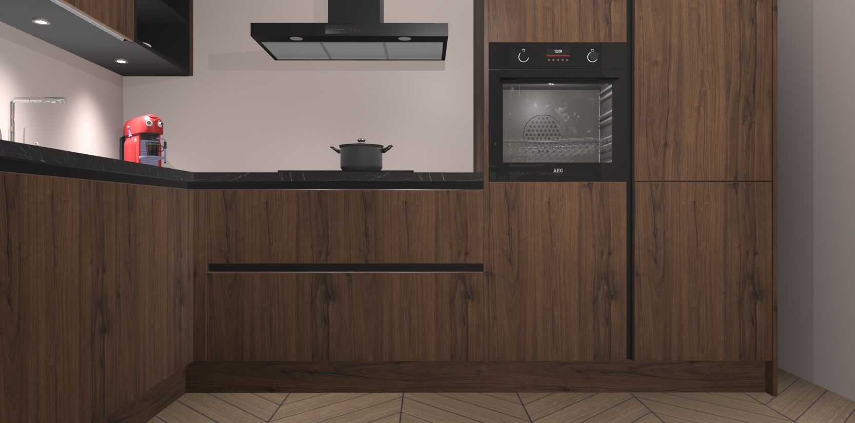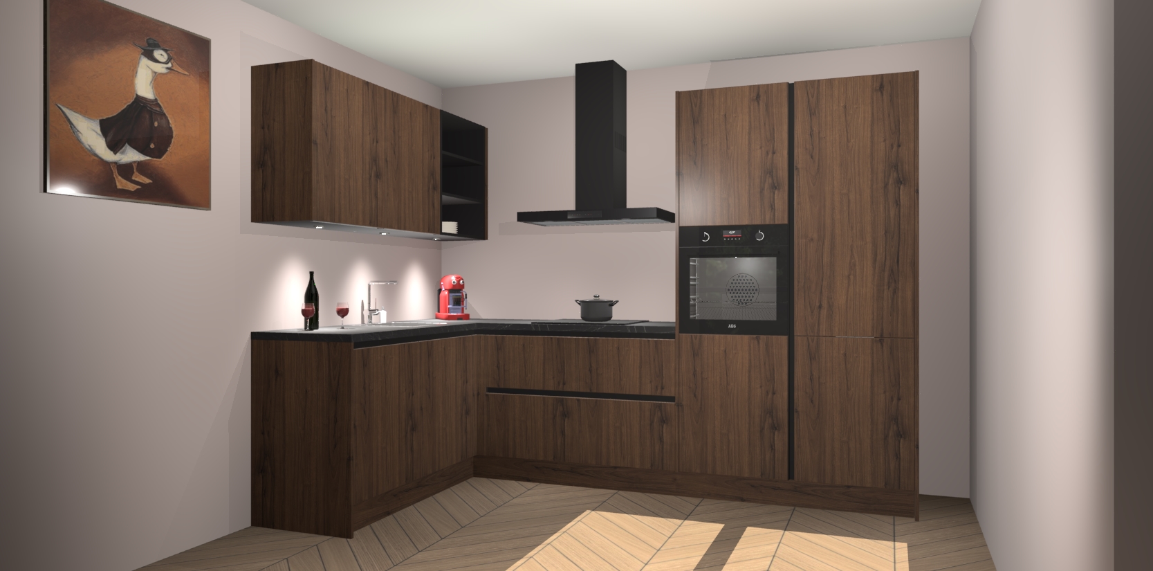 De Noten greeploze keuken Cognac is een adembenemend ontwerp met een modern en tijdloos uiterlijk. Deze luxe keuken straalt echt aristocratisch uit, waardoor uw koken plezieriger zal worden! Het prachtige design begint bij de hoekkeuken, wat perfect past bij elk type interieur. Bovendien bevat deze hoogwaardige set vijf inbouwapparaten - van oven tot koelkast - die via bestelling naar AEG geüpgraded kunnen worden!