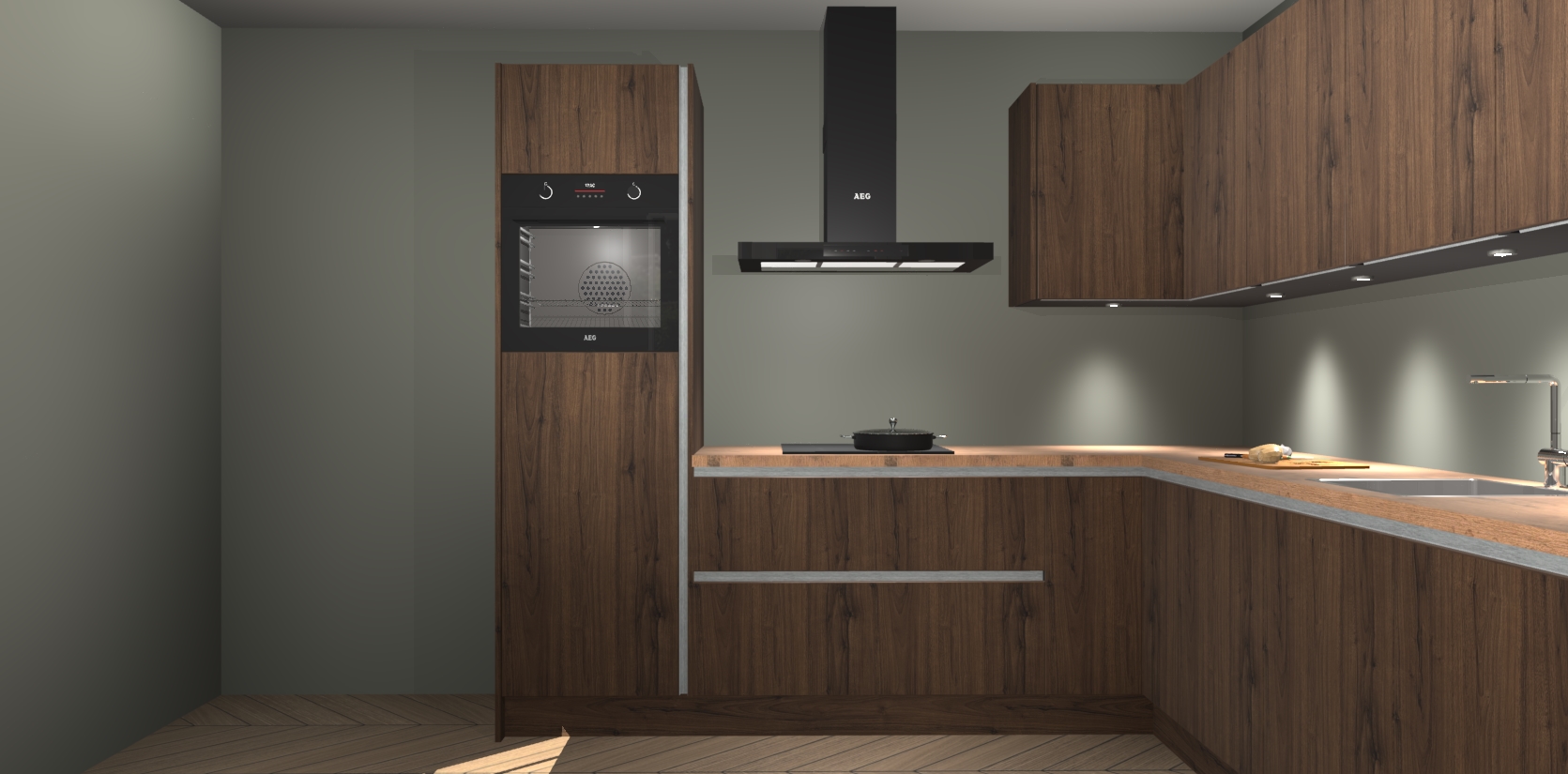 De Noten greeploze keuken Debar is uitgerust met vijf inbouwapparaten die elke kooktaak handig en efficiënt maken. Een oven, inductiekookplaat, afzuigkap, vaatwasser en koelkast zijn standaard, maar kunnen na bestelling eenvoudig worden geupgrade naar AEG. Profiteer vervolgens van de softclose deuren voor snelle toegang en geruisloze toegang.