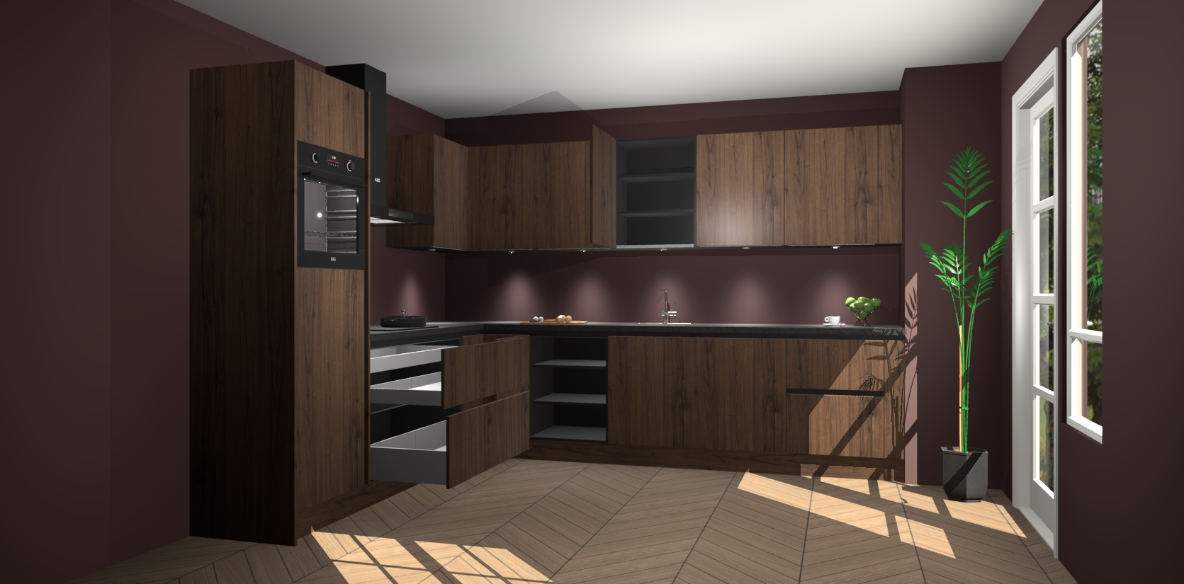 De Noten greeploze keuken Debar is uitgerust met vijf inbouwapparaten die elke kooktaak handig en efficiënt maken. Een oven, inductiekookplaat, afzuigkap, vaatwasser en koelkast zijn standaard, maar kunnen na bestelling eenvoudig worden geupgrade naar AEG. Profiteer vervolgens van de softclose deuren voor snelle toegang en geruisloze toegang.