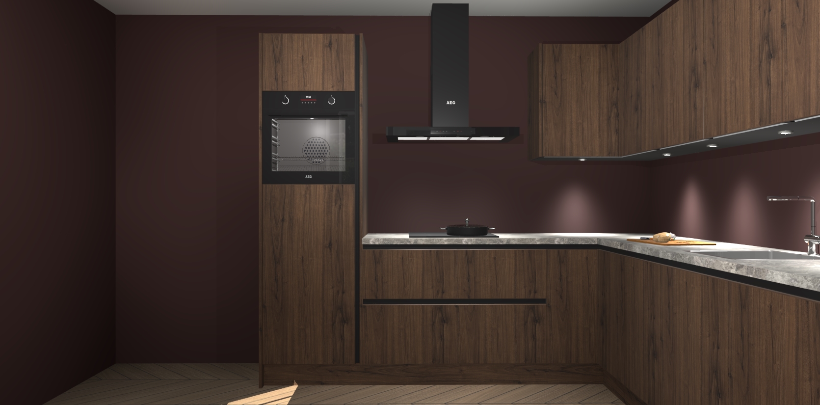 De Noten greeploze keuken Debar is uitgerust met vijf inbouwapparaten die elke kooktaak handig en efficiënt maken. Een oven, inductiekookplaat, afzuigkap, vaatwasser en koelkast zijn standaard, maar kunnen na bestelling eenvoudig worden geupgrade naar AEG. Profiteer vervolgens van de softclose deuren voor snelle toegang en geruisloze toegang.