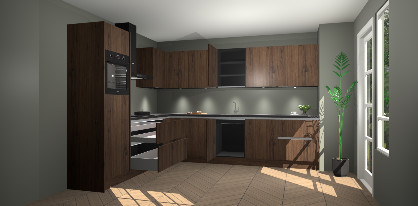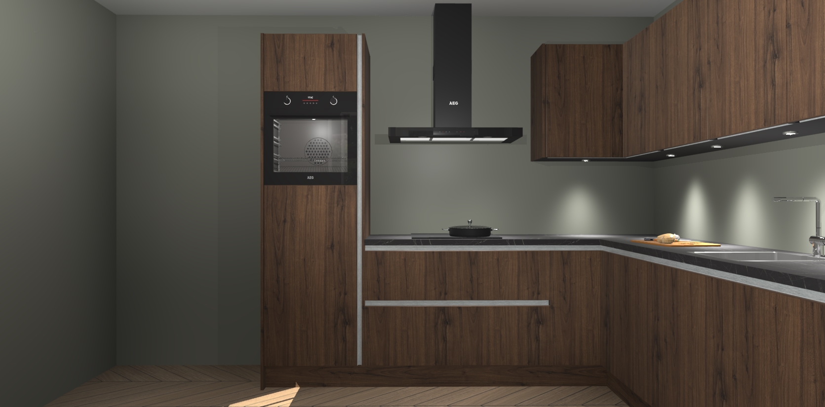De Noten greeploze keuken Debar is uitgerust met vijf inbouwapparaten die elke kooktaak handig en efficiënt maken. Een oven, inductiekookplaat, afzuigkap, vaatwasser en koelkast zijn standaard, maar kunnen na bestelling eenvoudig worden geupgrade naar AEG. Profiteer vervolgens van de softclose deuren voor snelle toegang en geruisloze toegang.