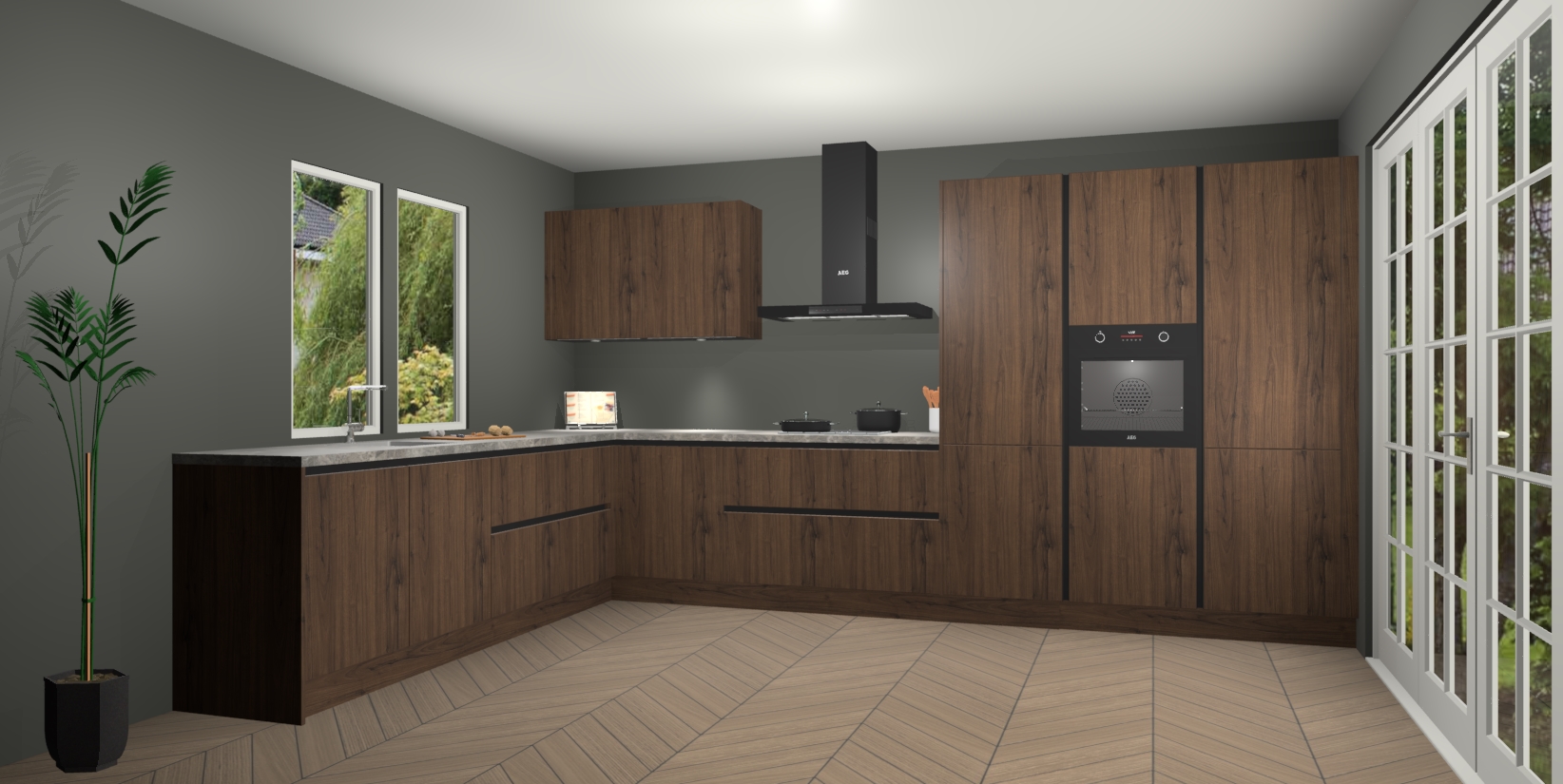 Kom dichtbij de perfecte keuken van uw dromen met de Noten greeploze keuken Debrecen. Met een prachtige houtlook en eigentijds ontwerp, straalt deze keuken warmte en sfeer uit. Of u nu liefhebber bent van traditionele of moderne stijlen, er is genoeg ruimte om aan al uw behoeften te voldoen.