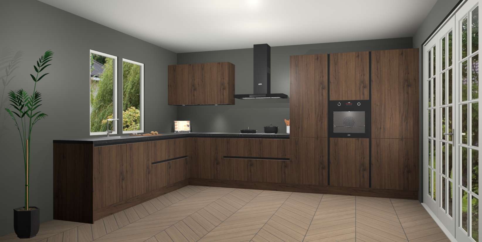 Kom dichtbij de perfecte keuken van uw dromen met de Noten greeploze keuken Debrecen. Met een prachtige houtlook en eigentijds ontwerp, straalt deze keuken warmte en sfeer uit. Of u nu liefhebber bent van traditionele of moderne stijlen, er is genoeg ruimte om aan al uw behoeften te voldoen.