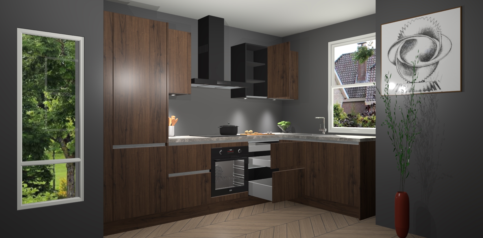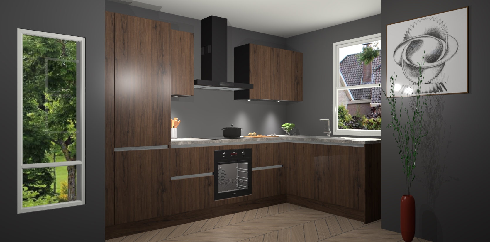 Bent u op zoek naar een moderne en tijdloze keuken die schoonheid in uw huis brengt? Zoek dan niet verder dan de Noten greeploze keuken Geneve - de perfecte keuken voor al uw wensen. Deze hoekkeuken biedt de hoogste Duitse kwaliteit voor een vaste lage prijs en is zeker een blikvanger in uw huis!