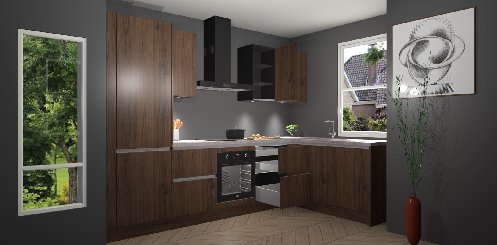 Bent u op zoek naar een moderne en tijdloze keuken die schoonheid in uw huis brengt? Zoek dan niet verder dan de Noten greeploze keuken Geneve - de perfecte keuken voor al uw wensen. Deze hoekkeuken biedt de hoogste Duitse kwaliteit voor een vaste lage prijs en is zeker een blikvanger in uw huis!