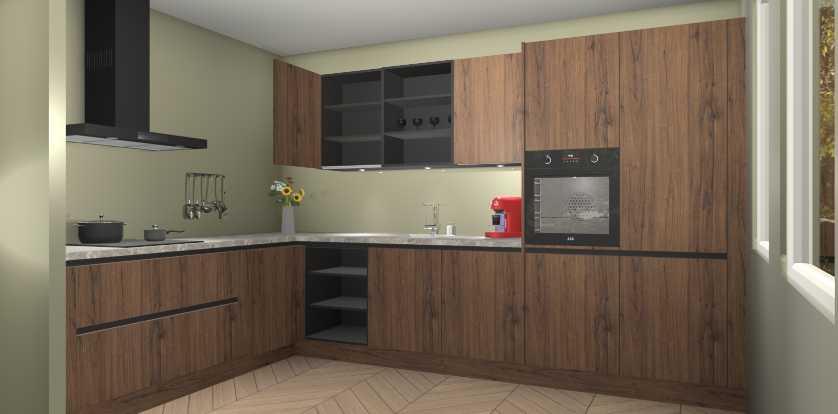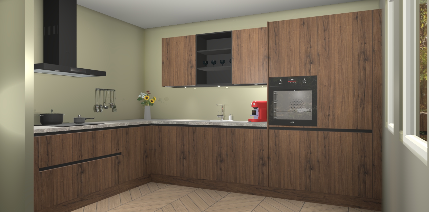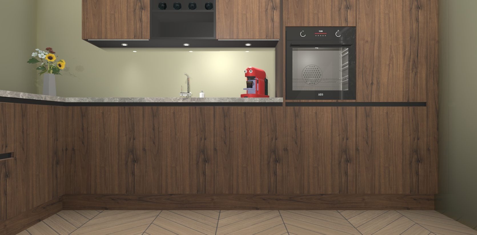 De Noten greeploze keuken Gotenburg is zo ontworpen dat u alle mogelijke vormen van opslagruimte kunt genieten. Bovendien heeft u meteen toegang tot vijf ingebouwde apparaten: een oven, inductiekookplaat, afzuigkap, vaatwasser en koelkast. Gewoon upgraden naar AEG na bestelling? Dit kan heel gemakkelijk worden geregeld. De deuren sluiten zacht dankzij zachtsluitende scharnieren en ze houden warmte vast terwijl ze uitzonderlijk stil blijven wanneer ze worden geopend of gesloten.