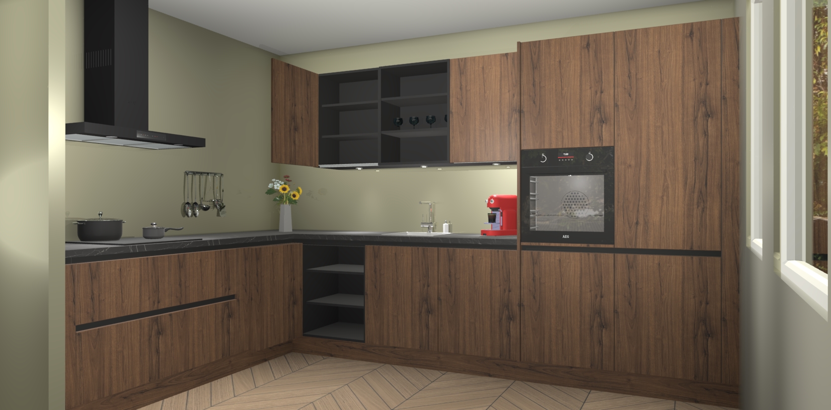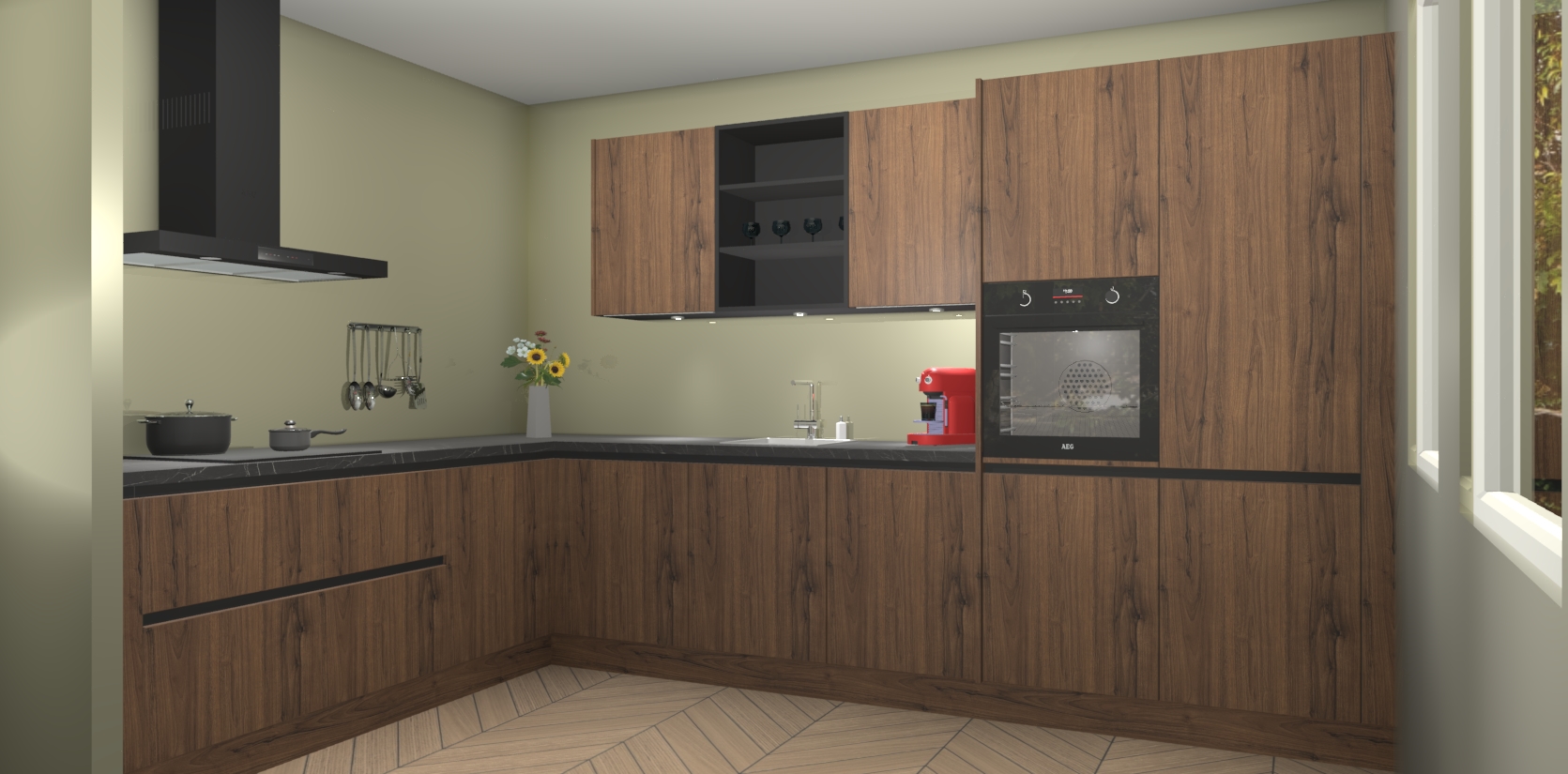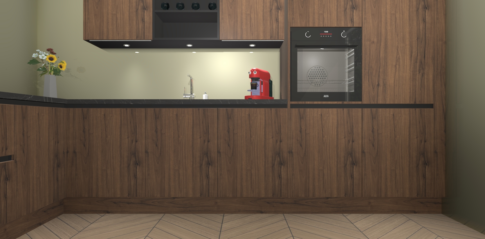 De Noten greeploze keuken Gotenburg is zo ontworpen dat u alle mogelijke vormen van opslagruimte kunt genieten. Bovendien heeft u meteen toegang tot vijf ingebouwde apparaten: een oven, inductiekookplaat, afzuigkap, vaatwasser en koelkast. Gewoon upgraden naar AEG na bestelling? Dit kan heel gemakkelijk worden geregeld. De deuren sluiten zacht dankzij zachtsluitende scharnieren en ze houden warmte vast terwijl ze uitzonderlijk stil blijven wanneer ze worden geopend of gesloten.