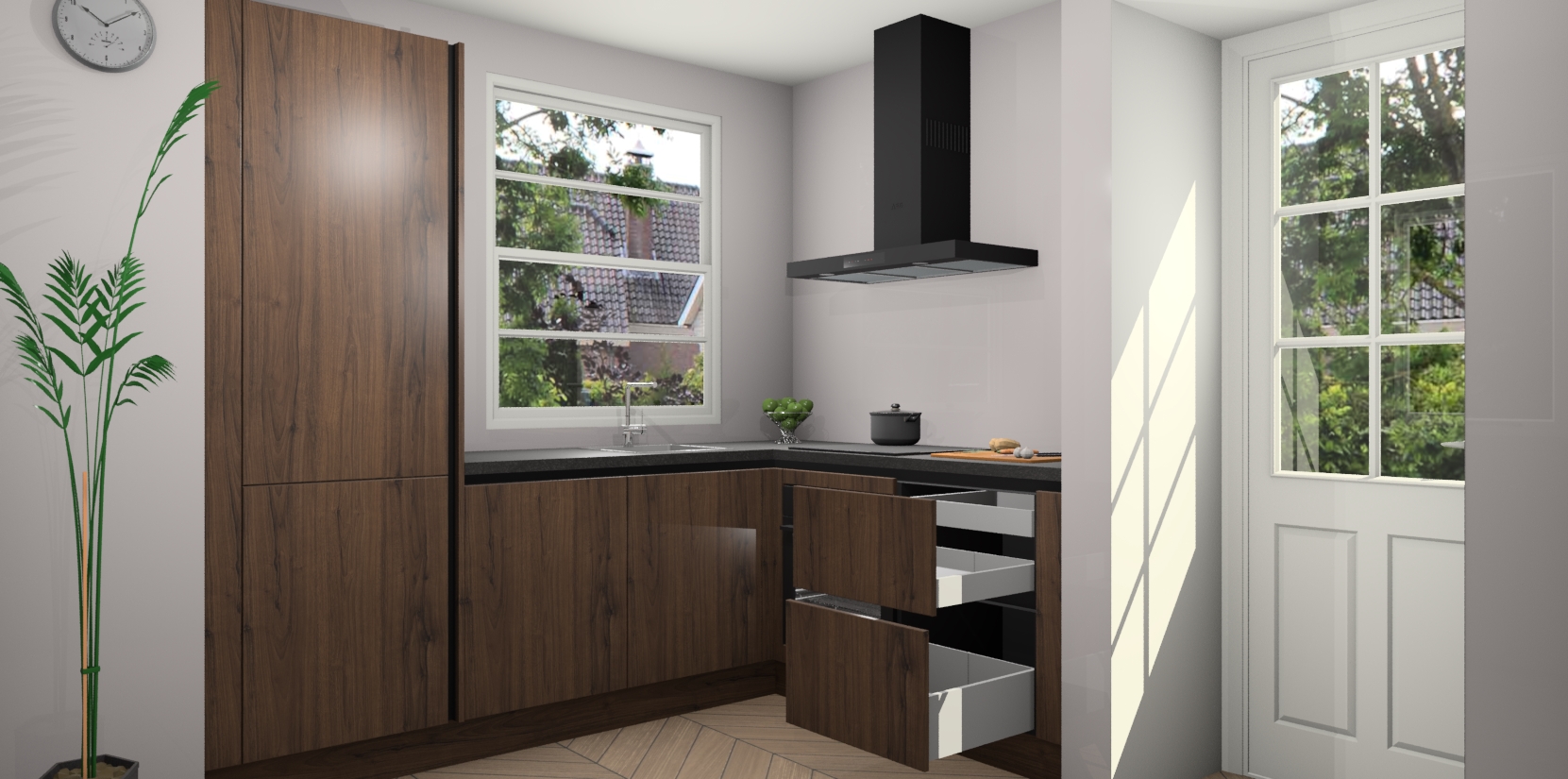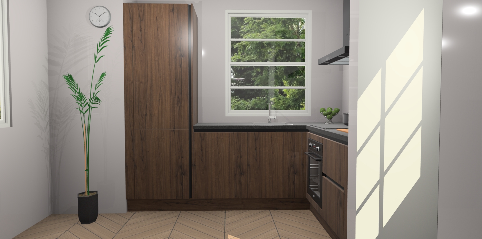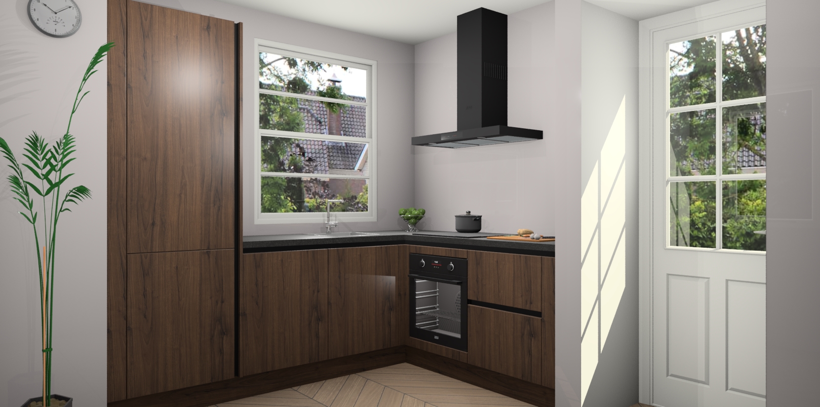 Wilt u een echte aanwinst voor uw keuken, maar bent u op zoek naar iets specialers dan de standaardkeukens? Kies dan voor de Noten greeploze keuken Harbin! Dit prachtige hoekkeukenontwerp geeft u alle ruimte om optimaal te genieten van heerlijk koken. Het uitmuntende afwerkingsniveau, de fraaie houtstructuur en de sfeervolle zwarte grepen maken van de Noten greeploze keuken Harbin de perfecte keuze voor zowel enthousiaste thuiskoks als design-minded interieurliefhebbers.