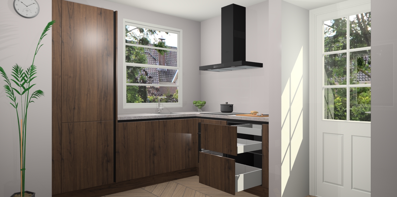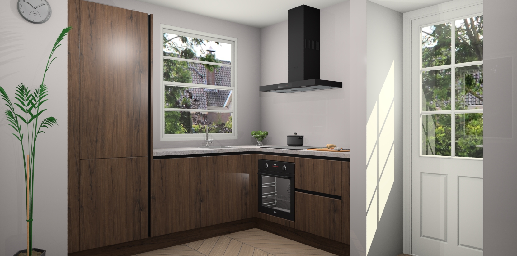 Wilt u een echte aanwinst voor uw keuken, maar bent u op zoek naar iets specialers dan de standaardkeukens? Kies dan voor de Noten greeploze keuken Harbin! Dit prachtige hoekkeukenontwerp geeft u alle ruimte om optimaal te genieten van heerlijk koken. Het uitmuntende afwerkingsniveau, de fraaie houtstructuur en de sfeervolle zwarte grepen maken van de Noten greeploze keuken Harbin de perfecte keuze voor zowel enthousiaste thuiskoks als design-minded interieurliefhebbers.