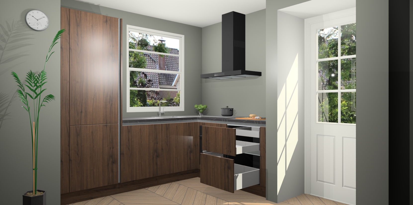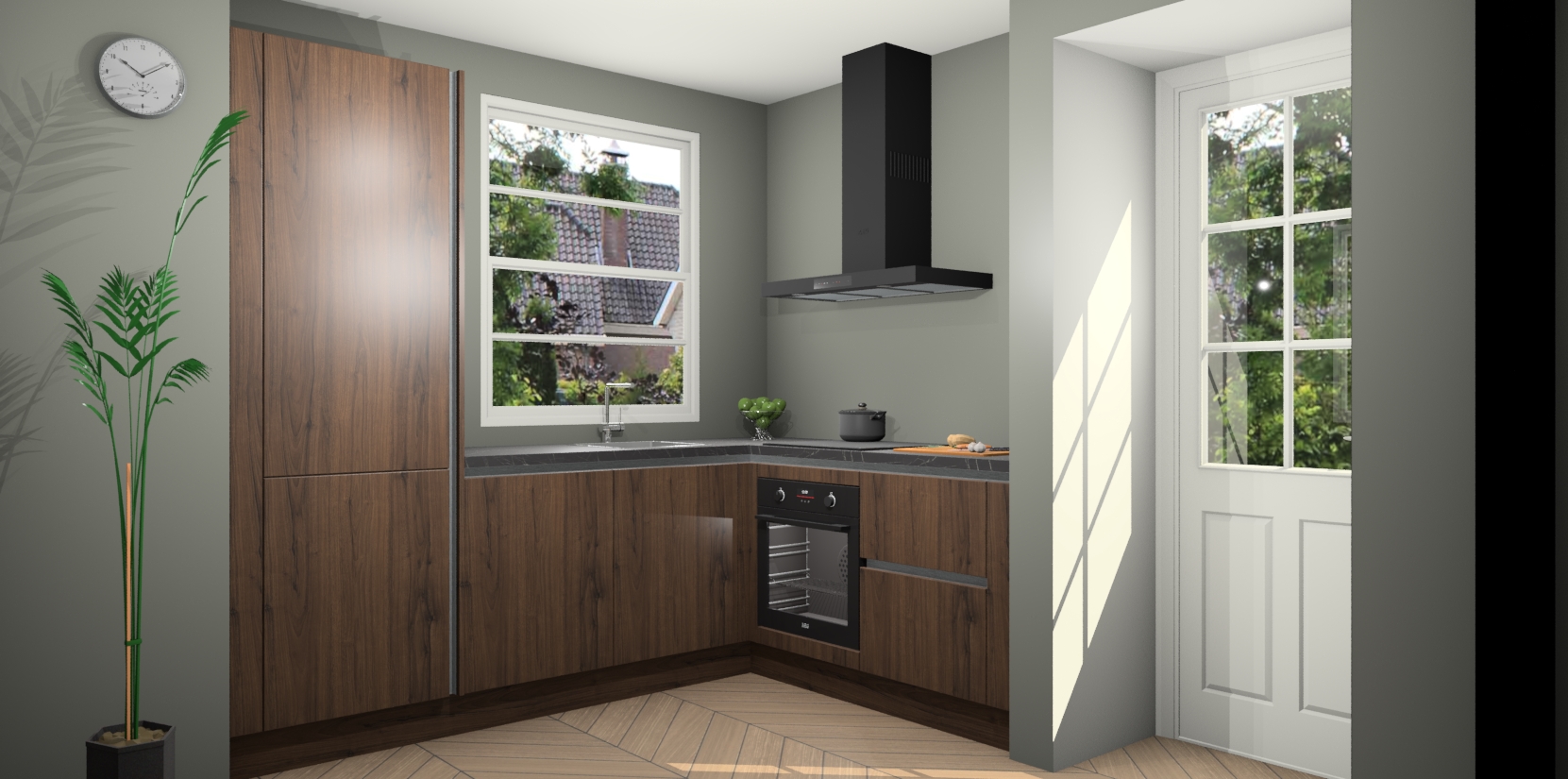 Wilt u een echte aanwinst voor uw keuken, maar bent u op zoek naar iets specialers dan de standaardkeukens? Kies dan voor de Noten greeploze keuken Harbin! Dit prachtige hoekkeukenontwerp geeft u alle ruimte om optimaal te genieten van heerlijk koken. Het uitmuntende afwerkingsniveau, de fraaie houtstructuur en de sfeervolle zwarte grepen maken van de Noten greeploze keuken Harbin de perfecte keuze voor zowel enthousiaste thuiskoks als design-minded interieurliefhebbers.
