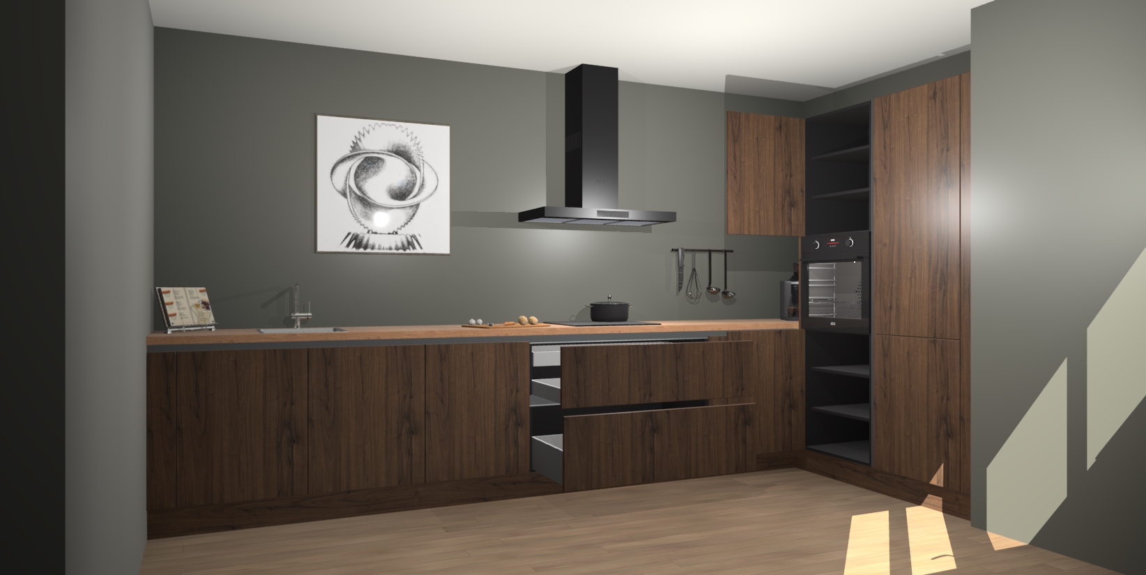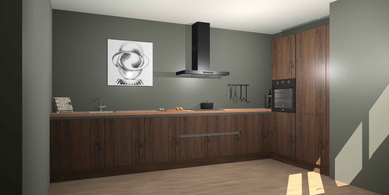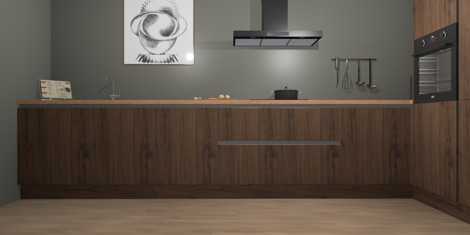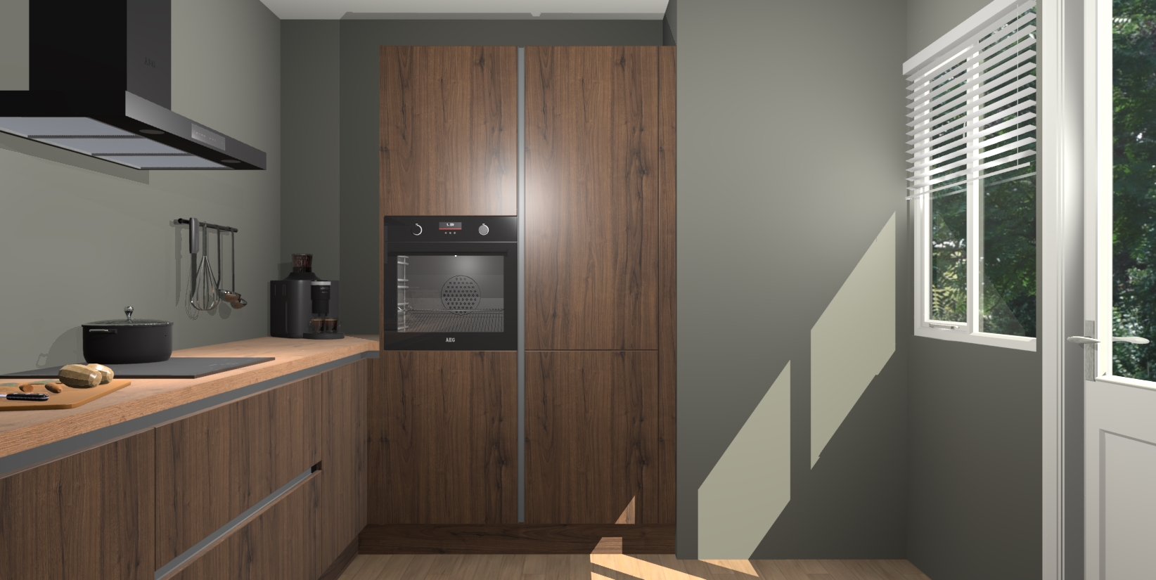 Welkom bij de Noten greeploze keuken Khao Lak. Deze prachtige keuken zal de komende jaren het middelpunt van de belangstelling in uw huis zijn. Uitgerust met vijf inbouwapparaten komt u nooit kookgereedschap tekort. Bovendien geeft de warme houtlook elke ruimte een uitnodigende en tijdloze uitstraling.