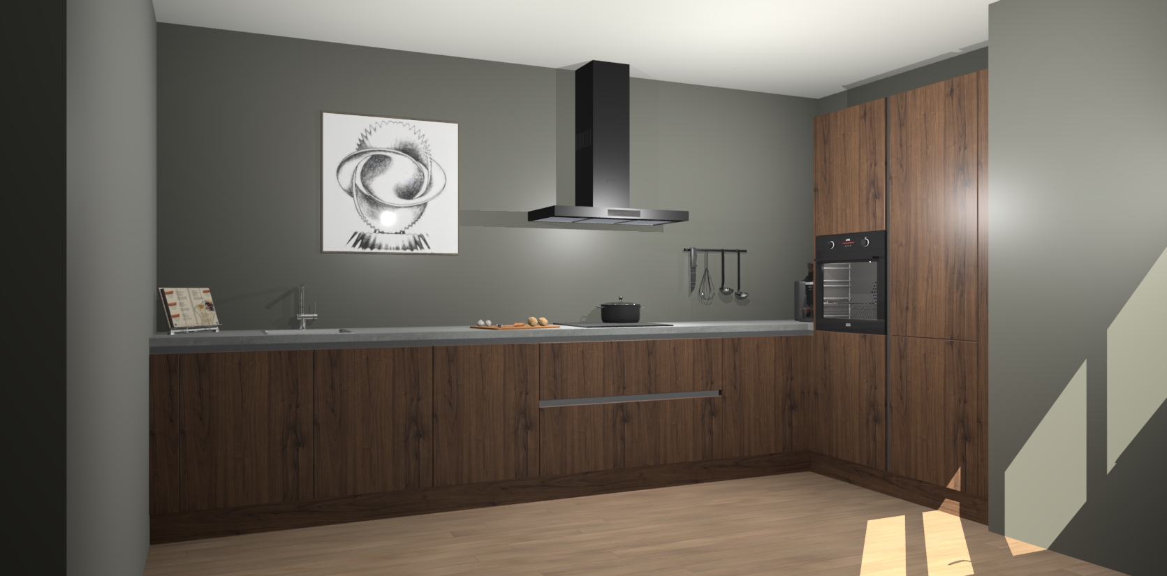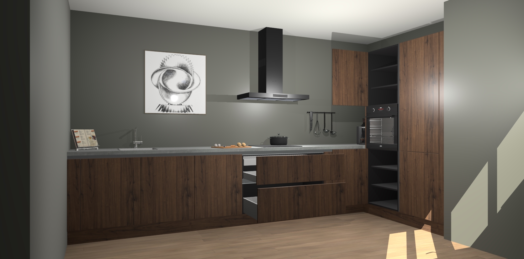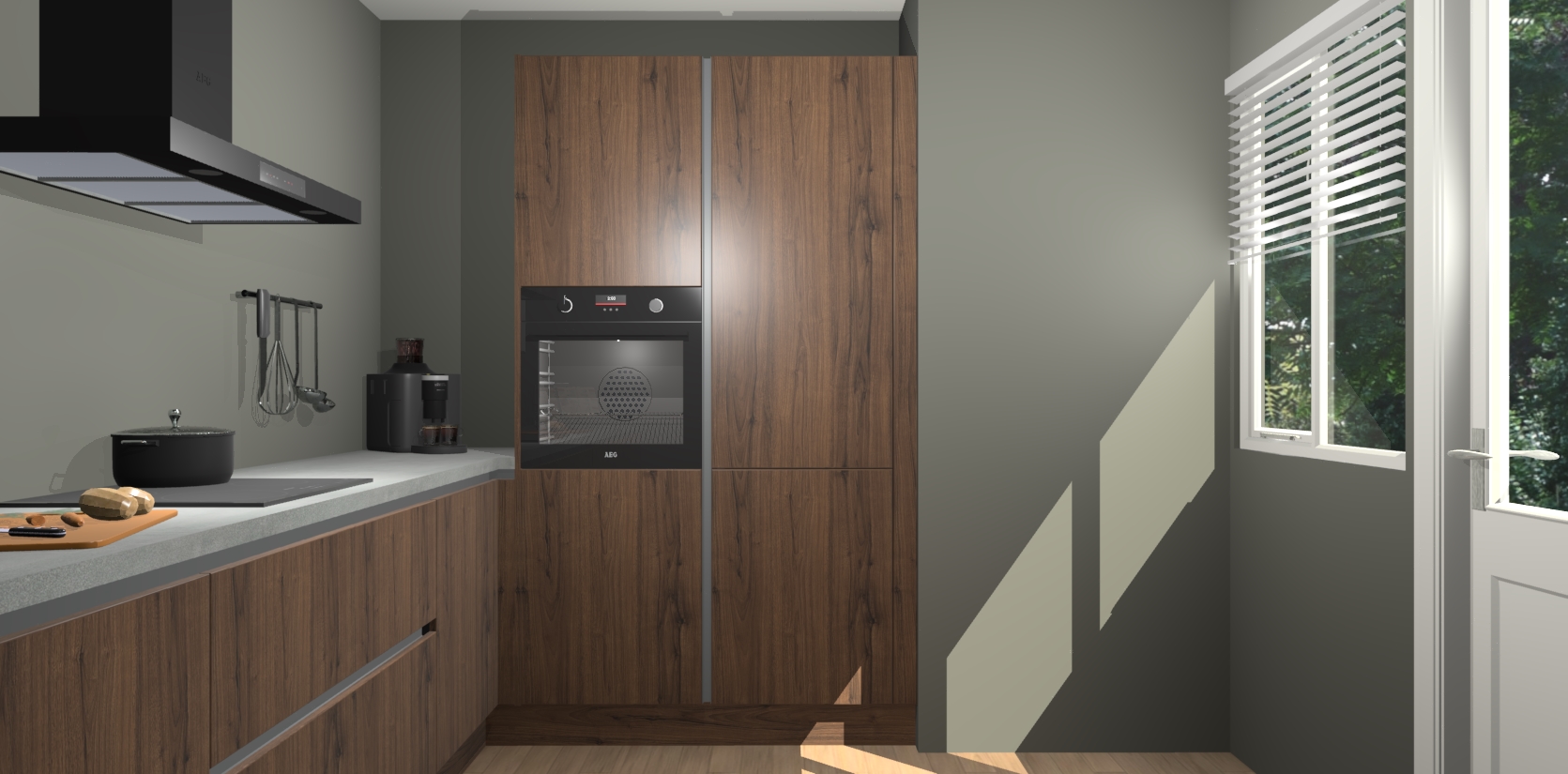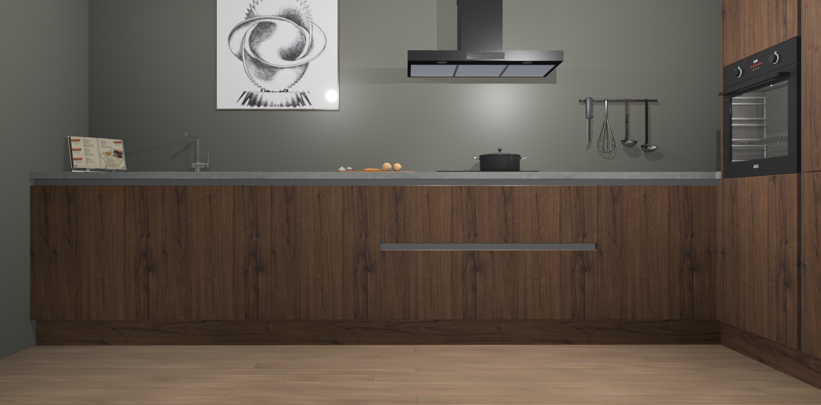 Welkom bij de Noten greeploze keuken Khao Lak. Deze prachtige keuken zal de komende jaren het middelpunt van de belangstelling in uw huis zijn. Uitgerust met vijf inbouwapparaten komt u nooit kookgereedschap tekort. Bovendien geeft de warme houtlook elke ruimte een uitnodigende en tijdloze uitstraling.