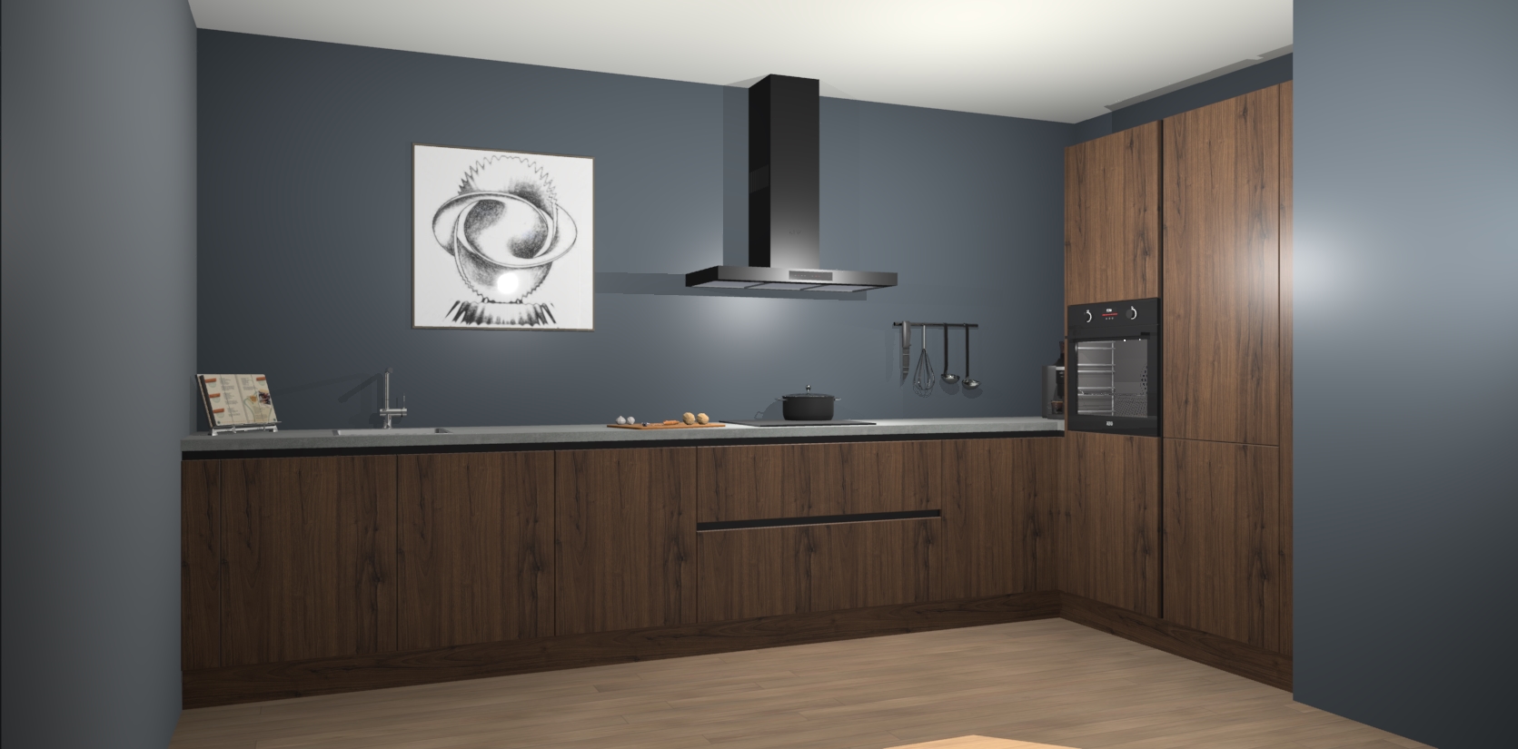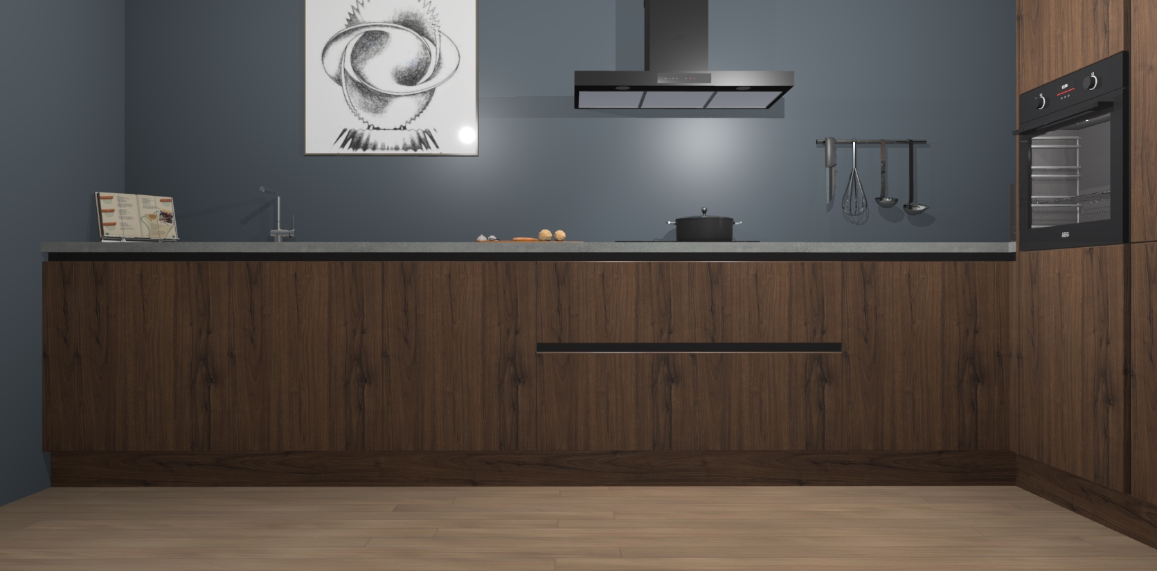 Welkom bij de Noten greeploze keuken Khao Lak. Deze prachtige keuken zal de komende jaren het middelpunt van de belangstelling in uw huis zijn. Uitgerust met vijf inbouwapparaten komt u nooit kookgereedschap tekort. Bovendien geeft de warme houtlook elke ruimte een uitnodigende en tijdloze uitstraling.