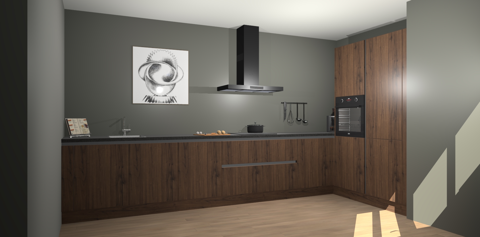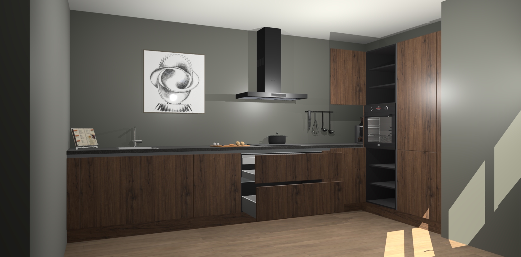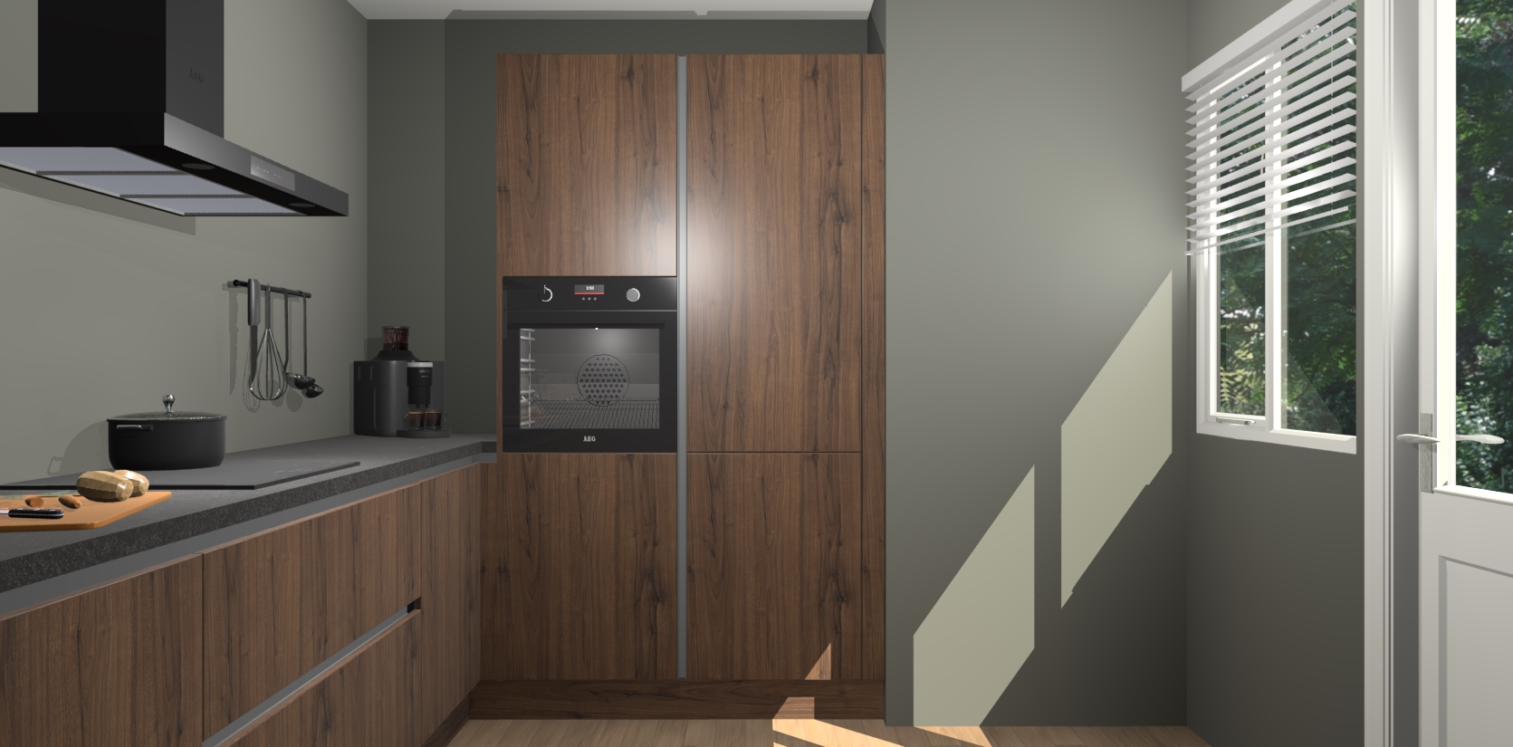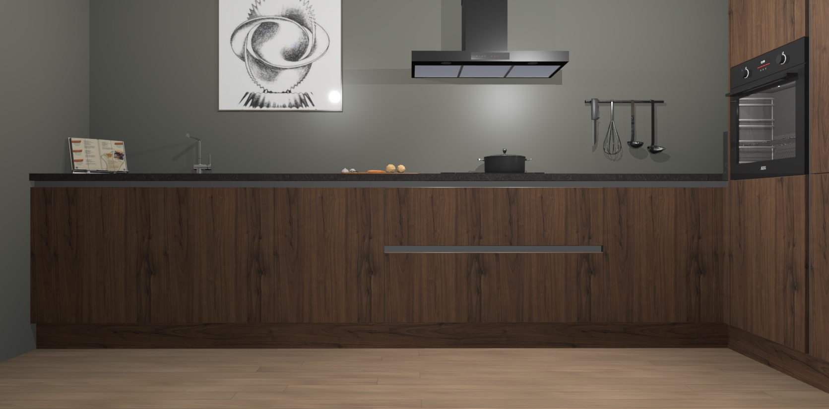 Welkom bij de Noten greeploze keuken Khao Lak. Deze prachtige keuken zal de komende jaren het middelpunt van de belangstelling in uw huis zijn. Uitgerust met vijf inbouwapparaten komt u nooit kookgereedschap tekort. Bovendien geeft de warme houtlook elke ruimte een uitnodigende en tijdloze uitstraling.