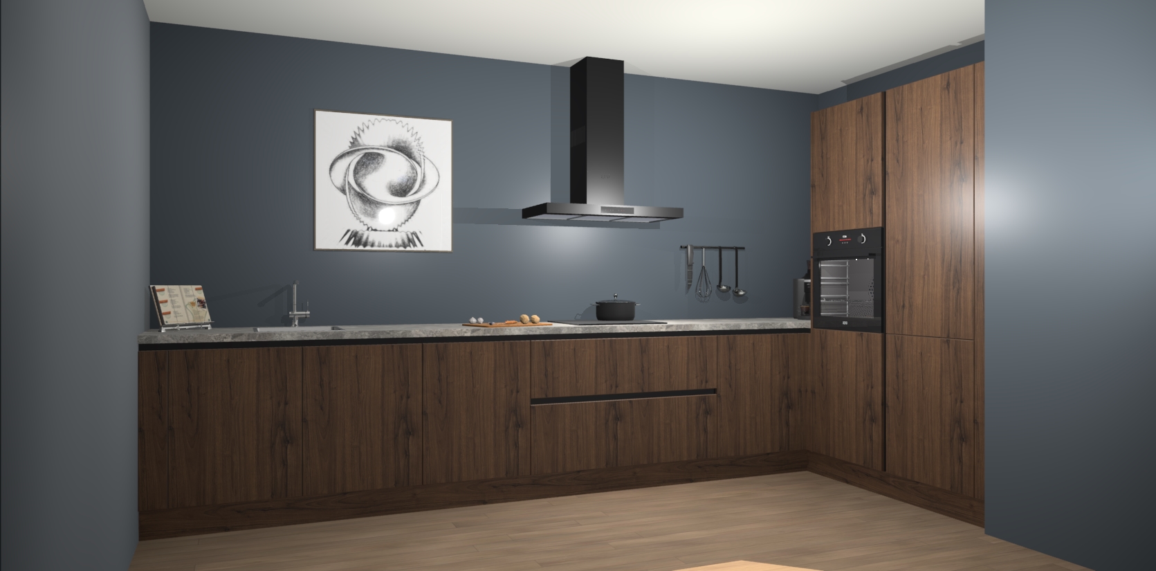 Welkom bij de Noten greeploze keuken Khao Lak. Deze prachtige keuken zal de komende jaren het middelpunt van de belangstelling in uw huis zijn. Uitgerust met vijf inbouwapparaten komt u nooit kookgereedschap tekort. Bovendien geeft de warme houtlook elke ruimte een uitnodigende en tijdloze uitstraling.