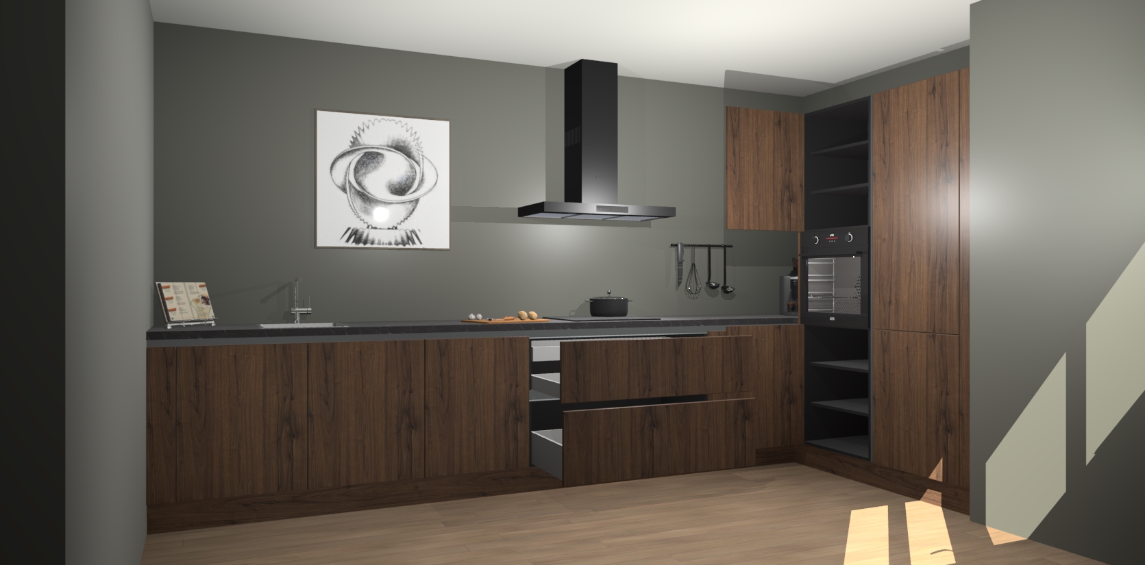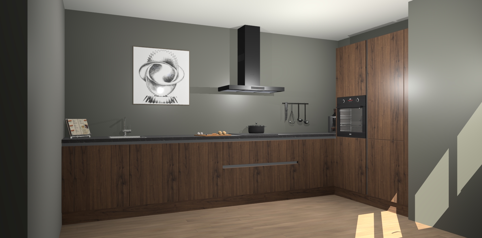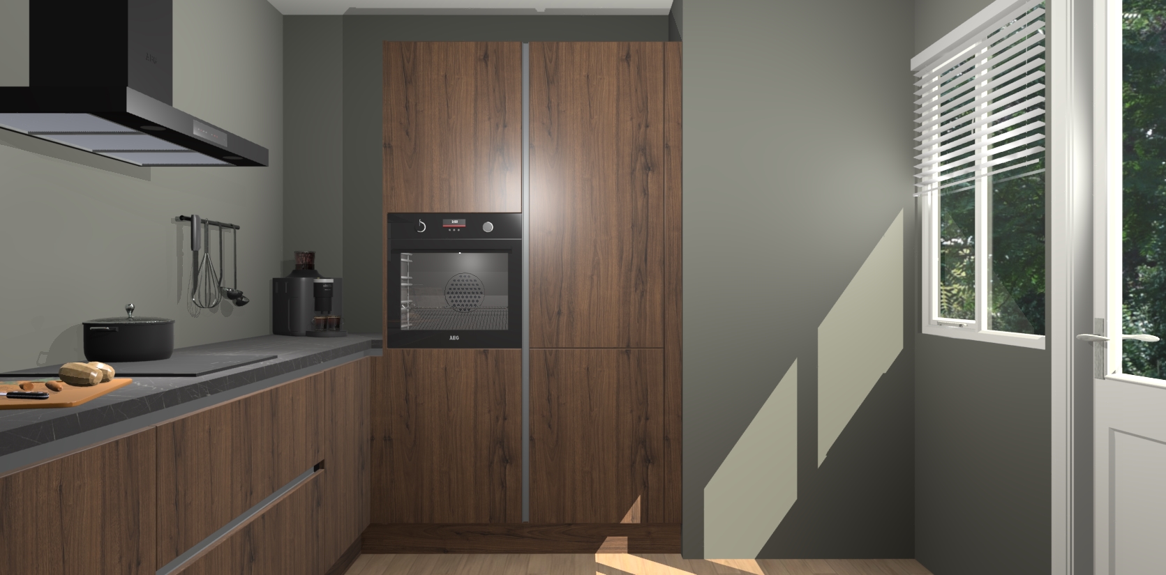 Welkom bij de Noten greeploze keuken Khao Lak. Deze prachtige keuken zal de komende jaren het middelpunt van de belangstelling in uw huis zijn. Uitgerust met vijf inbouwapparaten komt u nooit kookgereedschap tekort. Bovendien geeft de warme houtlook elke ruimte een uitnodigende en tijdloze uitstraling.
