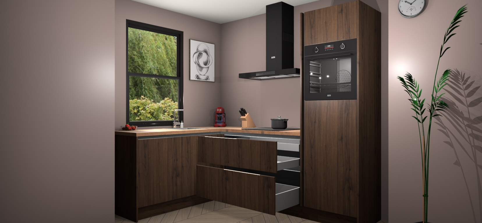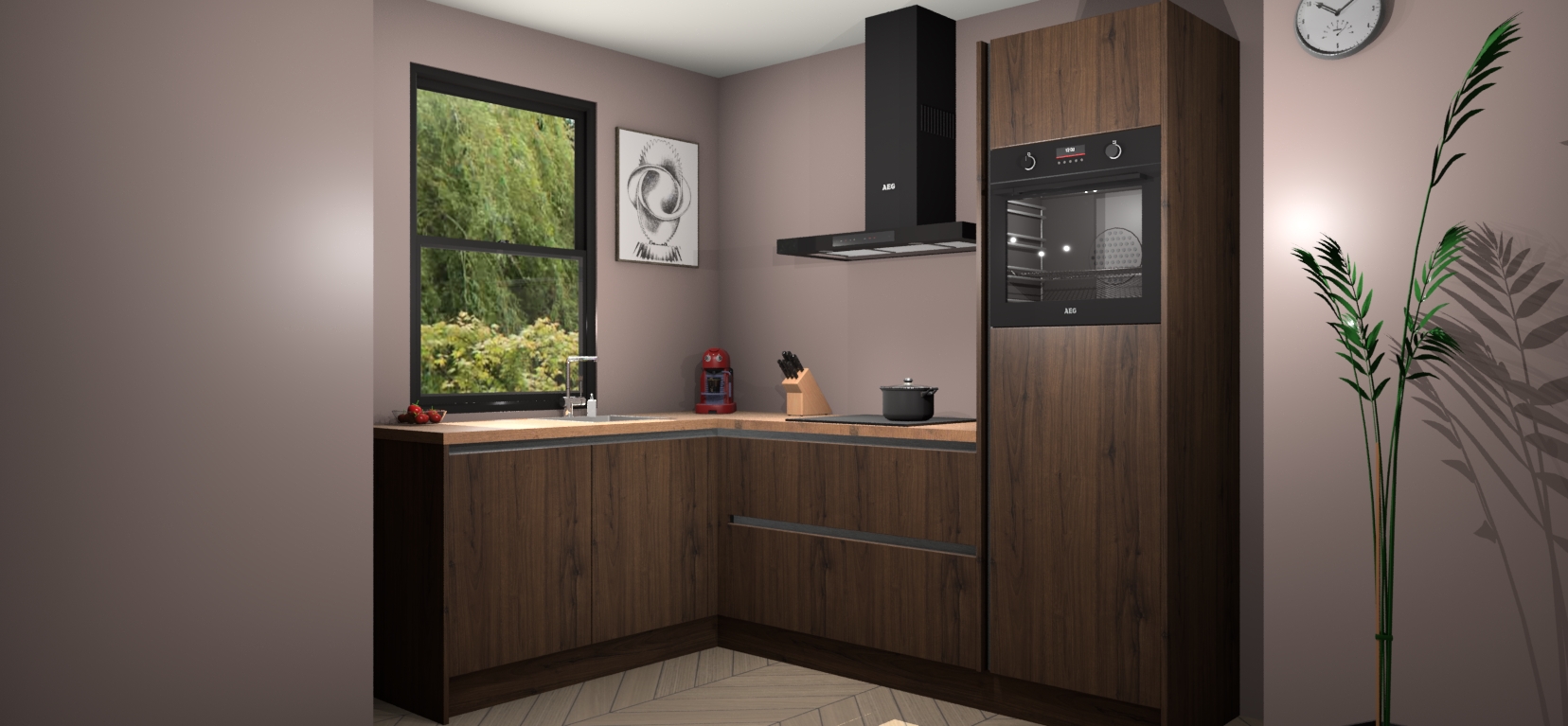 Deze prachtige hoekkeuken heeft alle benodigdheden om uw droomkook- en eetruimte compleet te maken. De Noten kasten bieden een echo van raffinement, terwijl de 5 inbouwapparaten genoeg opties bieden voor het bereiden van heerlijke maaltijden. De oven, inductiekookplaat, afzuigkap, vaatwasser en koelkast zorgen ervoor dat u tijd in de keuken zo efficiënt mogelijk verloopt, terwijl ze ook dat extra vleugje luxe bieden.
