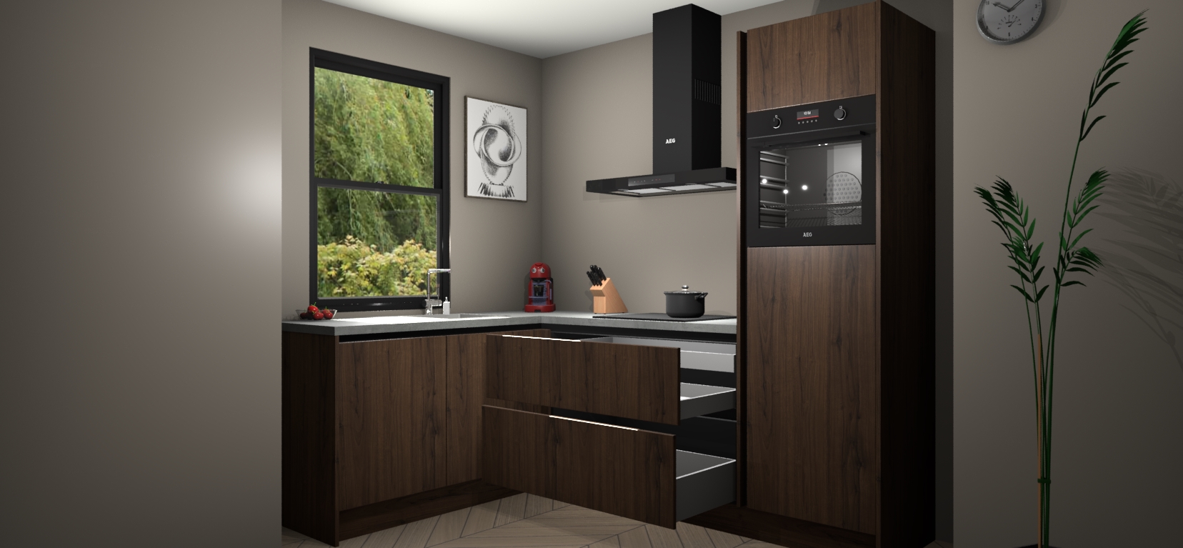 Deze prachtige hoekkeuken heeft alle benodigdheden om uw droomkook- en eetruimte compleet te maken. De Noten kasten bieden een echo van raffinement, terwijl de 5 inbouwapparaten genoeg opties bieden voor het bereiden van heerlijke maaltijden. De oven, inductiekookplaat, afzuigkap, vaatwasser en koelkast zorgen ervoor dat u tijd in de keuken zo efficiënt mogelijk verloopt, terwijl ze ook dat extra vleugje luxe bieden.