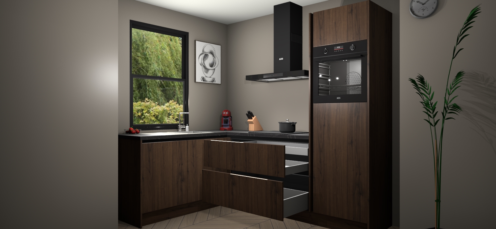 Deze prachtige hoekkeuken heeft alle benodigdheden om uw droomkook- en eetruimte compleet te maken. De Noten kasten bieden een echo van raffinement, terwijl de 5 inbouwapparaten genoeg opties bieden voor het bereiden van heerlijke maaltijden. De oven, inductiekookplaat, afzuigkap, vaatwasser en koelkast zorgen ervoor dat u tijd in de keuken zo efficiënt mogelijk verloopt, terwijl ze ook dat extra vleugje luxe bieden.