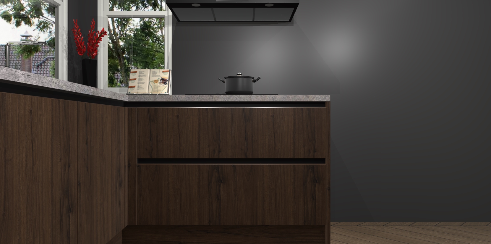 We hebben iets speciaals voor u: de Noten greeploze keuken Kotor. Het is een hoekkeuken die sfeer en warmte uitstraalt, en zijn hout-look geeft hem een unieke touch. Perfect voor elk huis!