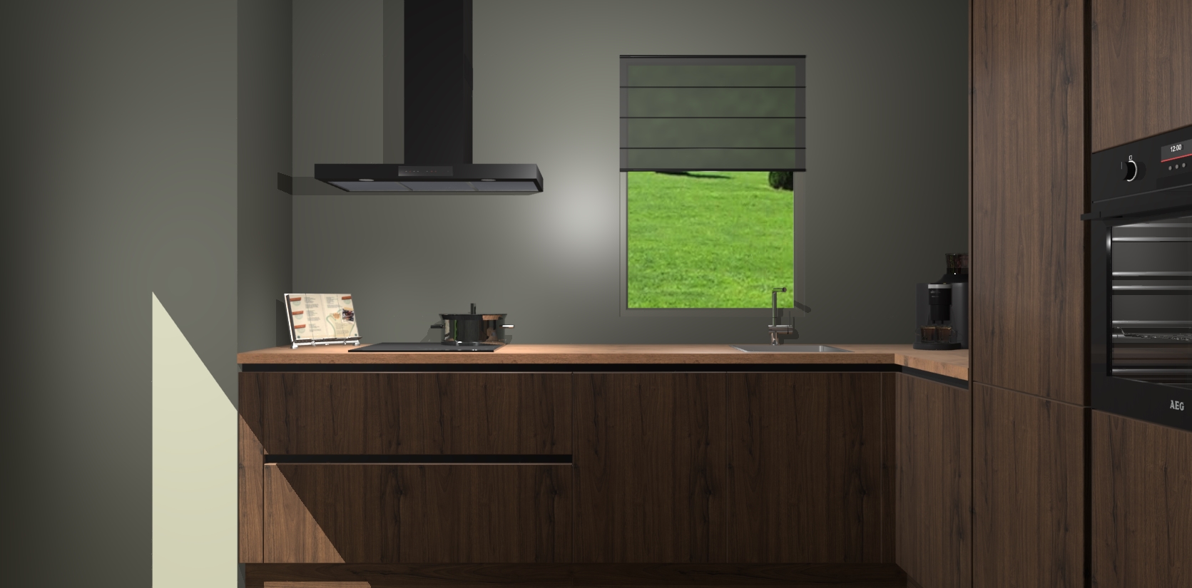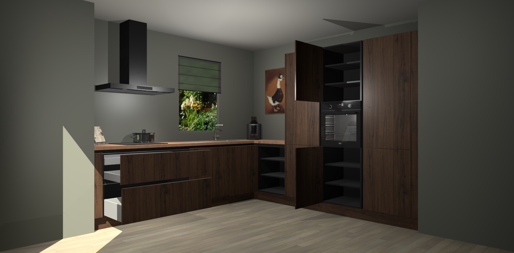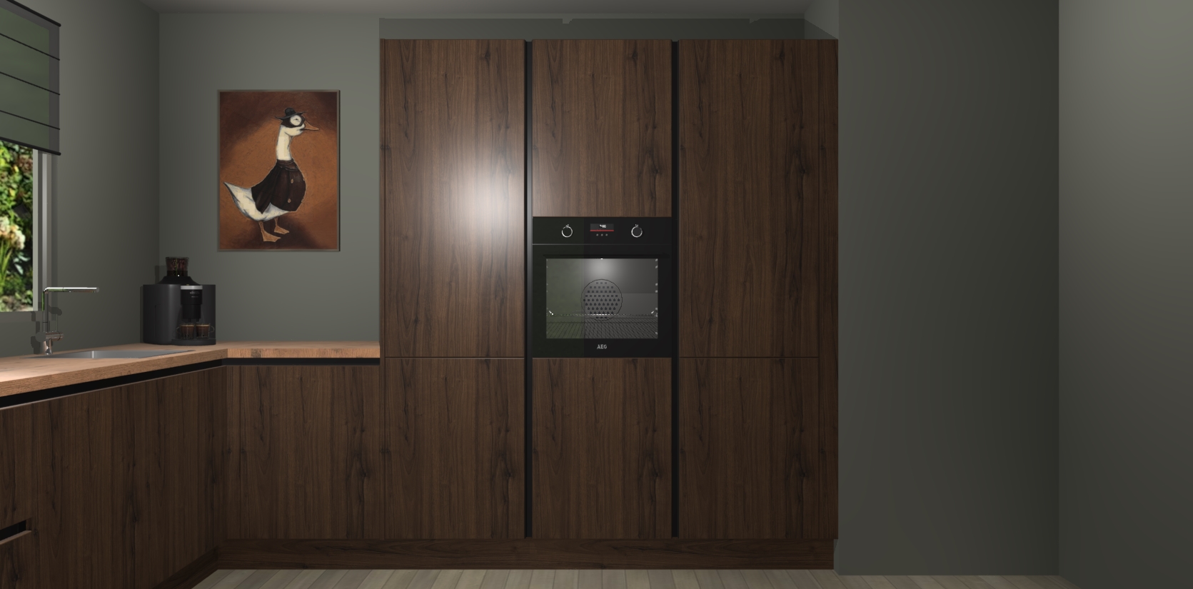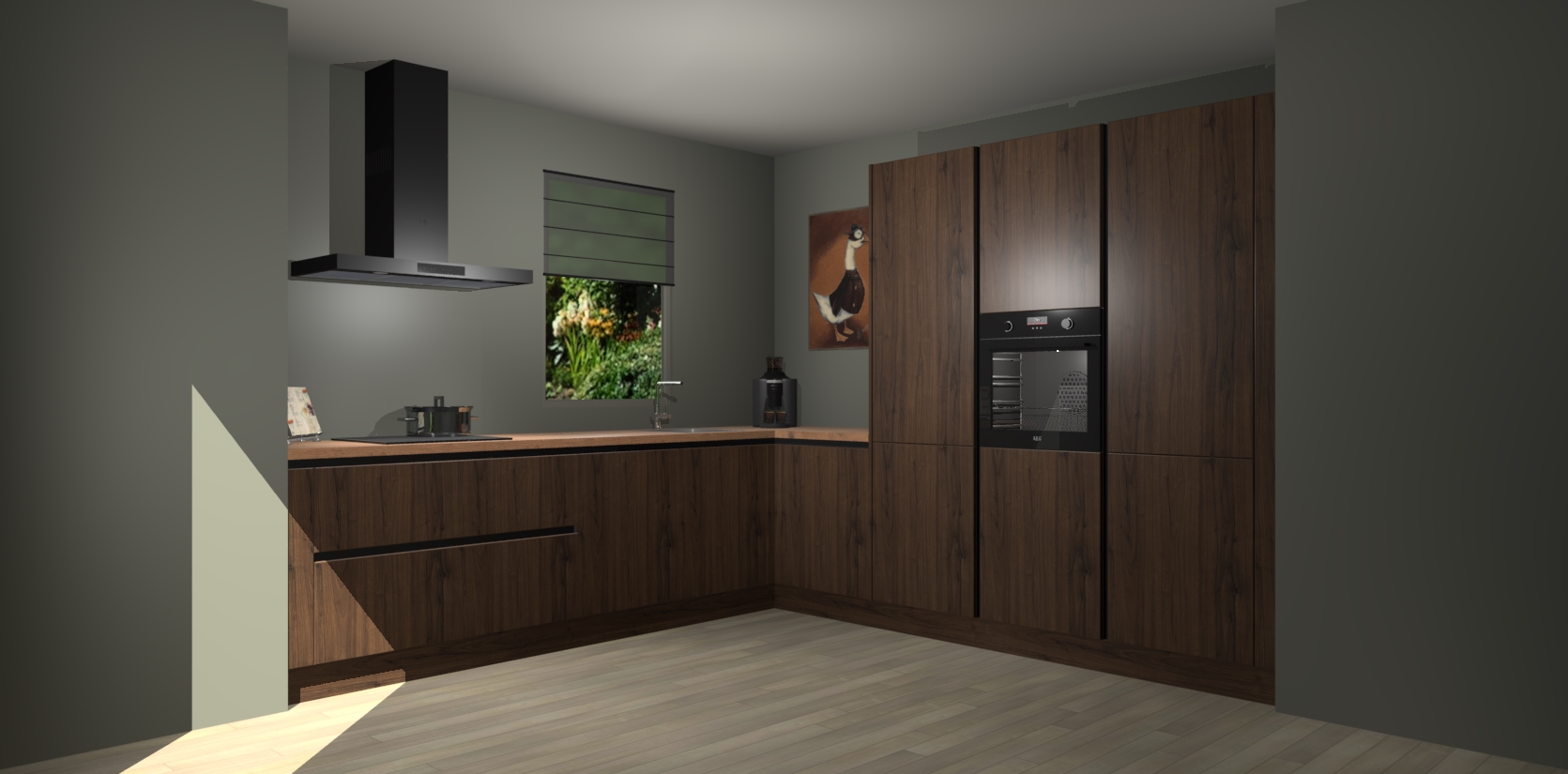 Welkom bij de Noten greeploze keuken Laos. Deze prachtige keuken zal de komende jaren het middelpunt van de belangstelling in uw huis zijn. Uitgerust met vijf inbouwapparaten komt u nooit kookgereedschap tekort. Bovendien geeft de warme houtlook elke ruimte een uitnodigende en tijdloze uitstraling.