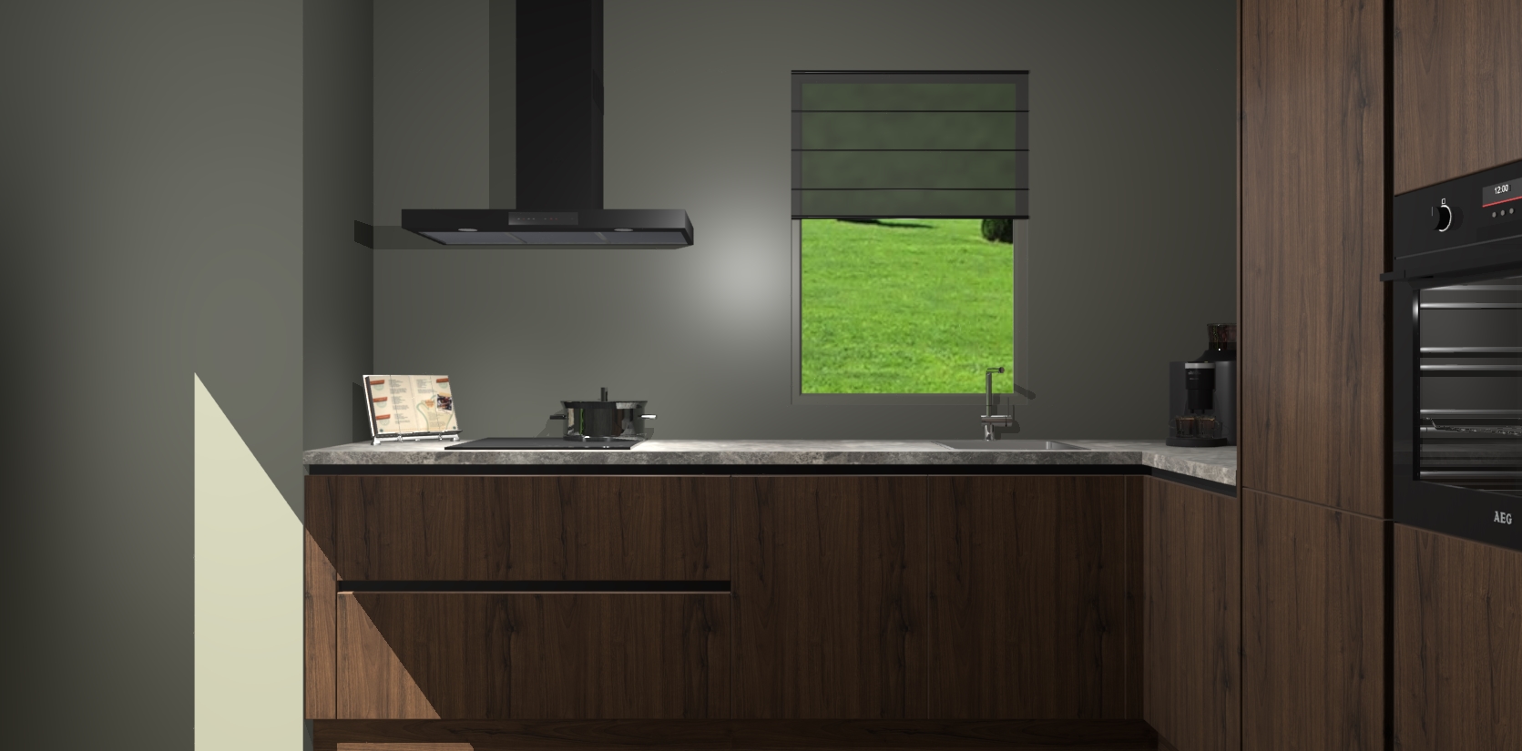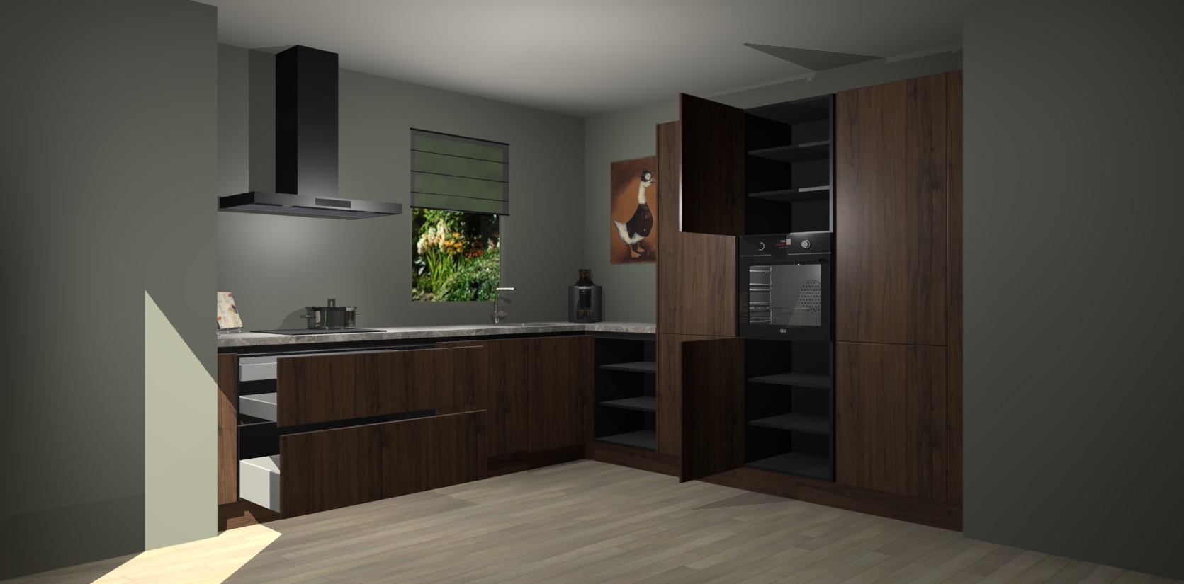 Welkom bij de Noten greeploze keuken Laos. Deze prachtige keuken zal de komende jaren het middelpunt van de belangstelling in uw huis zijn. Uitgerust met vijf inbouwapparaten komt u nooit kookgereedschap tekort. Bovendien geeft de warme houtlook elke ruimte een uitnodigende en tijdloze uitstraling.