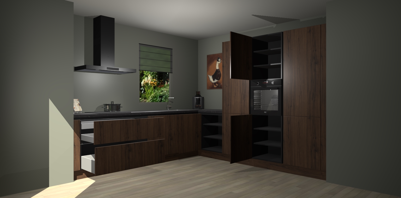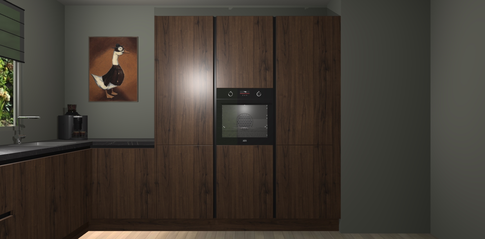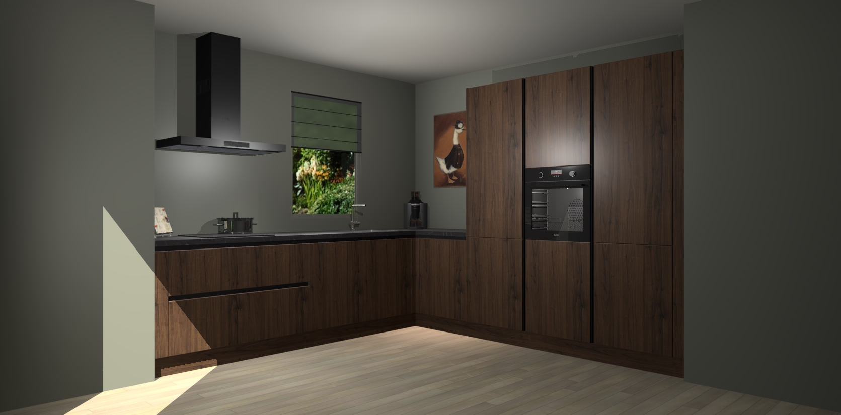 Welkom bij de Noten greeploze keuken Laos. Deze prachtige keuken zal de komende jaren het middelpunt van de belangstelling in uw huis zijn. Uitgerust met vijf inbouwapparaten komt u nooit kookgereedschap tekort. Bovendien geeft de warme houtlook elke ruimte een uitnodigende en tijdloze uitstraling.