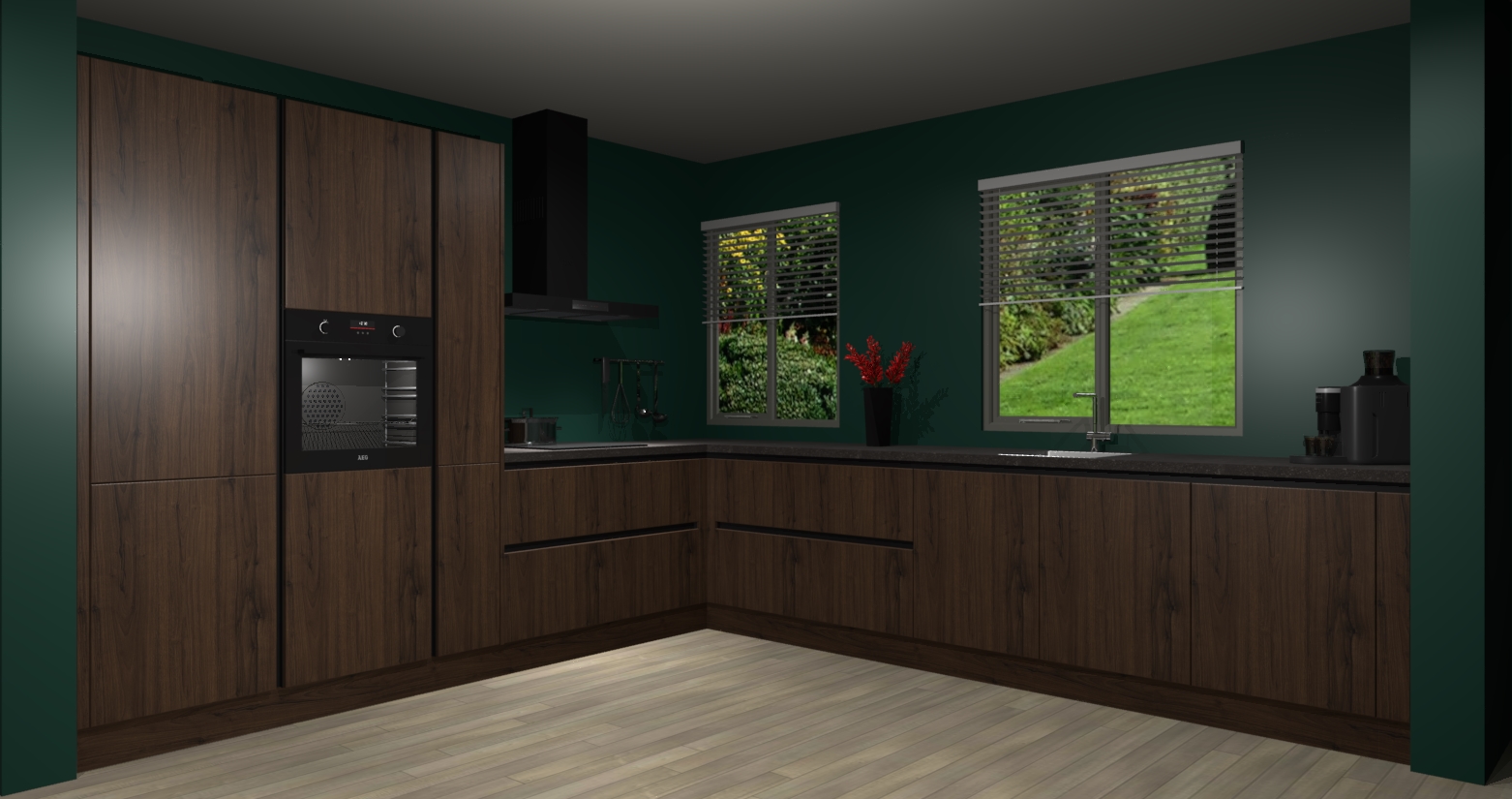 Welkom bij de Noten keuken Palermo. Deze prachtige keuken zal de komende jaren het middelpunt van de belangstelling in uw huis zijn. Uitgerust met vijf inbouwapparaten komt u nooit kookgereedschap tekort. Bovendien geeft de warme houtlook elke ruimte een uitnodigende en tijdloze uitstraling.