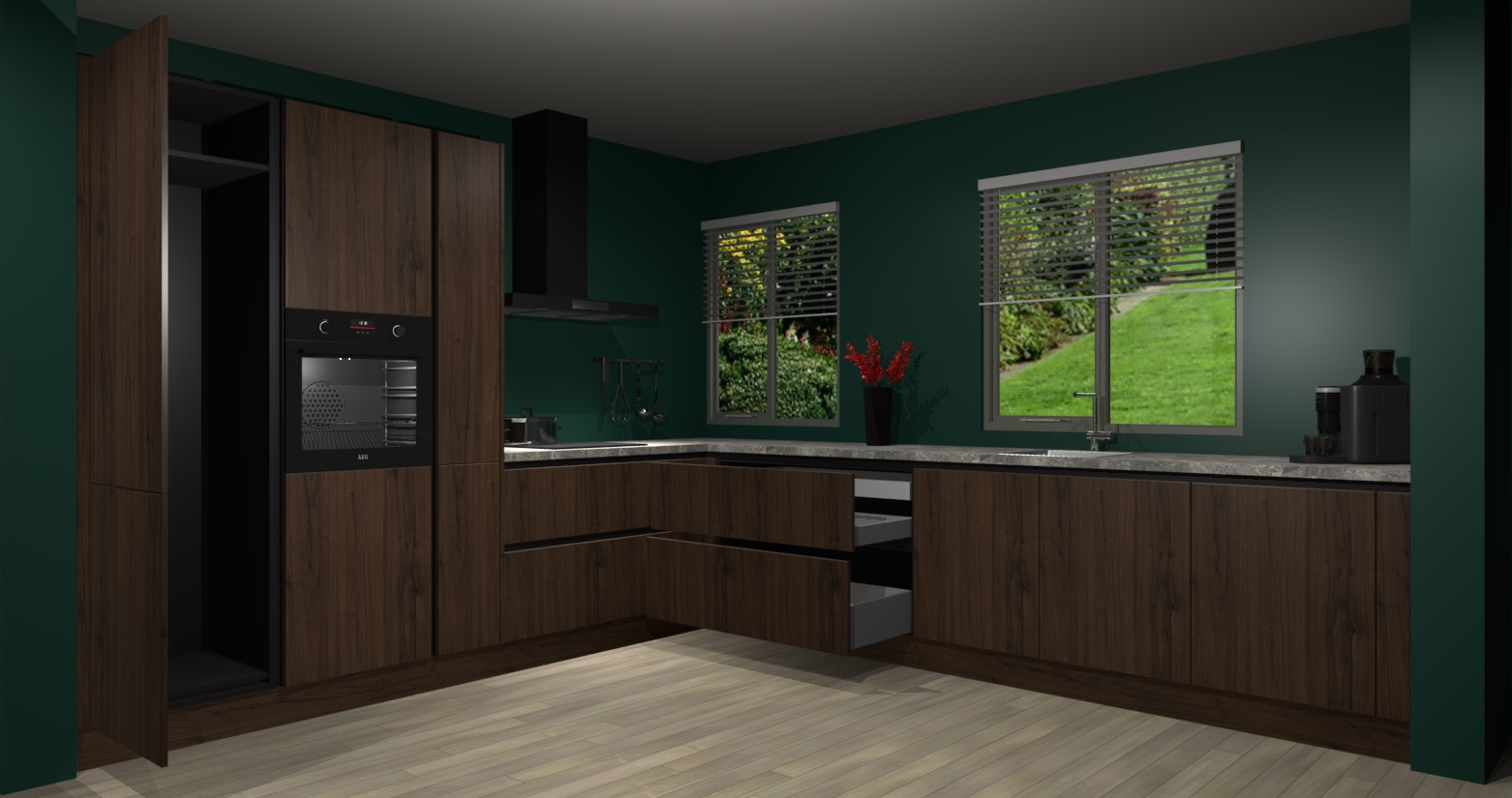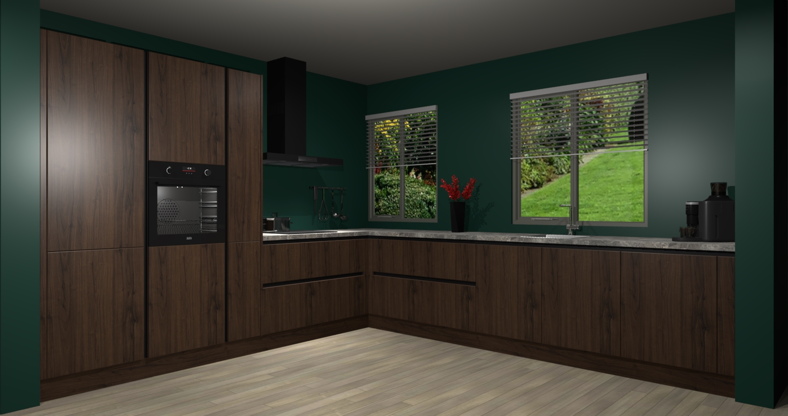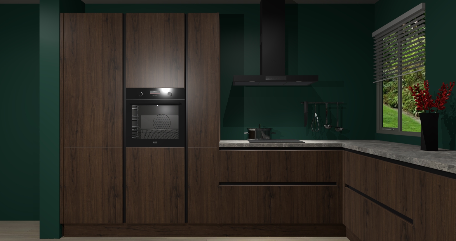 Welkom bij de Noten keuken Palermo. Deze prachtige keuken zal de komende jaren het middelpunt van de belangstelling in uw huis zijn. Uitgerust met vijf inbouwapparaten komt u nooit kookgereedschap tekort. Bovendien geeft de warme houtlook elke ruimte een uitnodigende en tijdloze uitstraling.