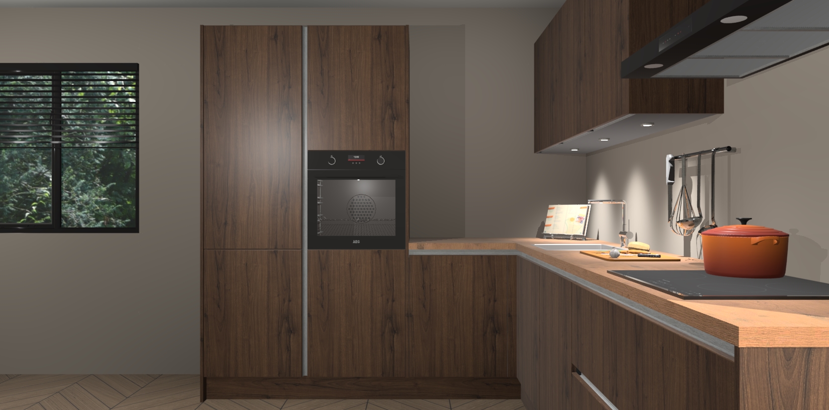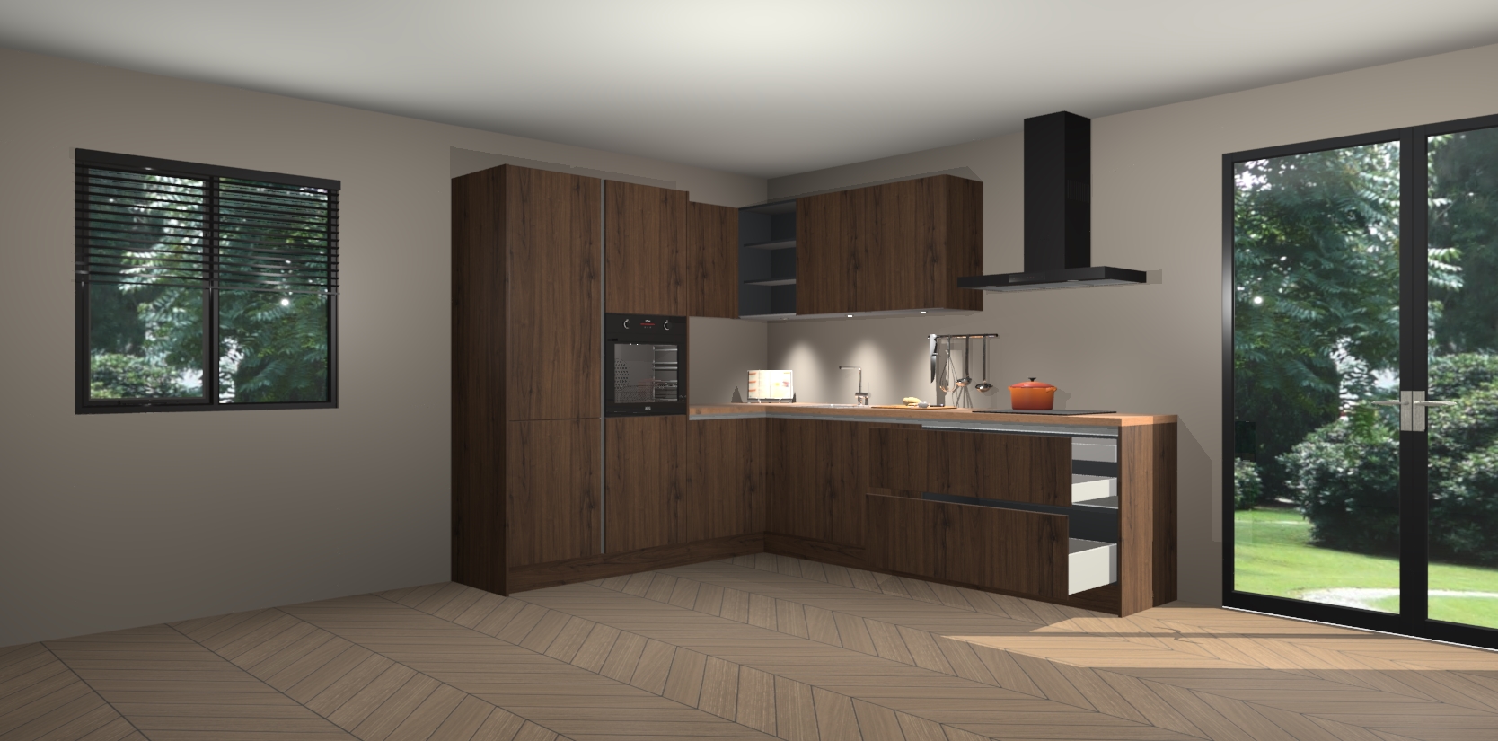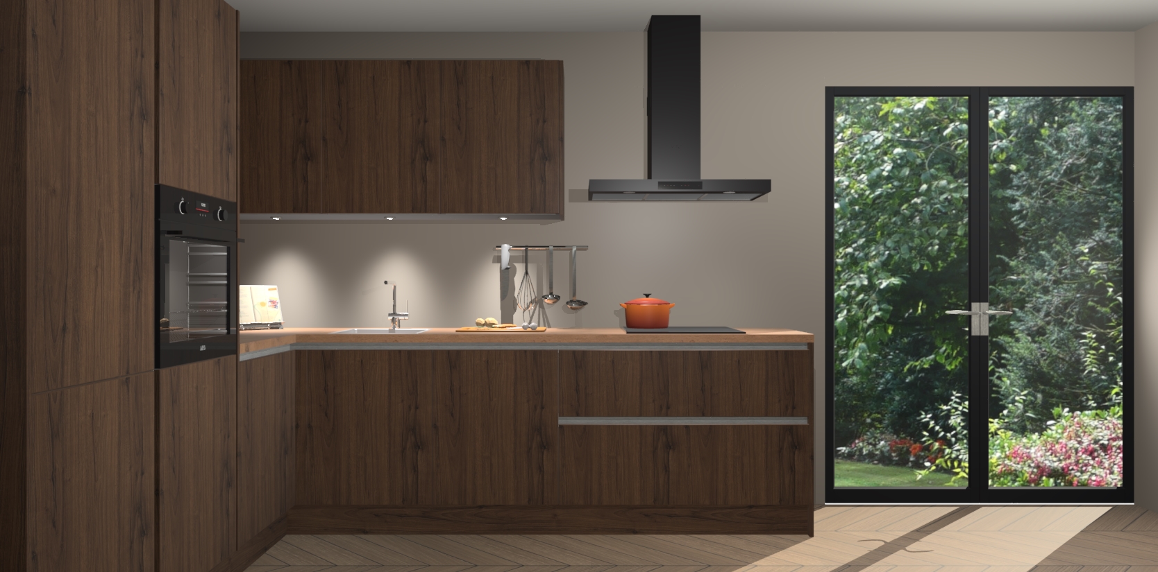 Maak kennis met de noten greeploze keuken Parla - de perfecte aanvulling voor uw moderne keuken! Ervaar tijdloos design, elegantie en een chique uitstraling met onze zwarte handgrepen, soft-close deuren en veel opbergruimte. Dit alles wordt aangeboden tegen een vaste lage prijs voor ongeëvenaarde Duitse keukenkwaliteit!