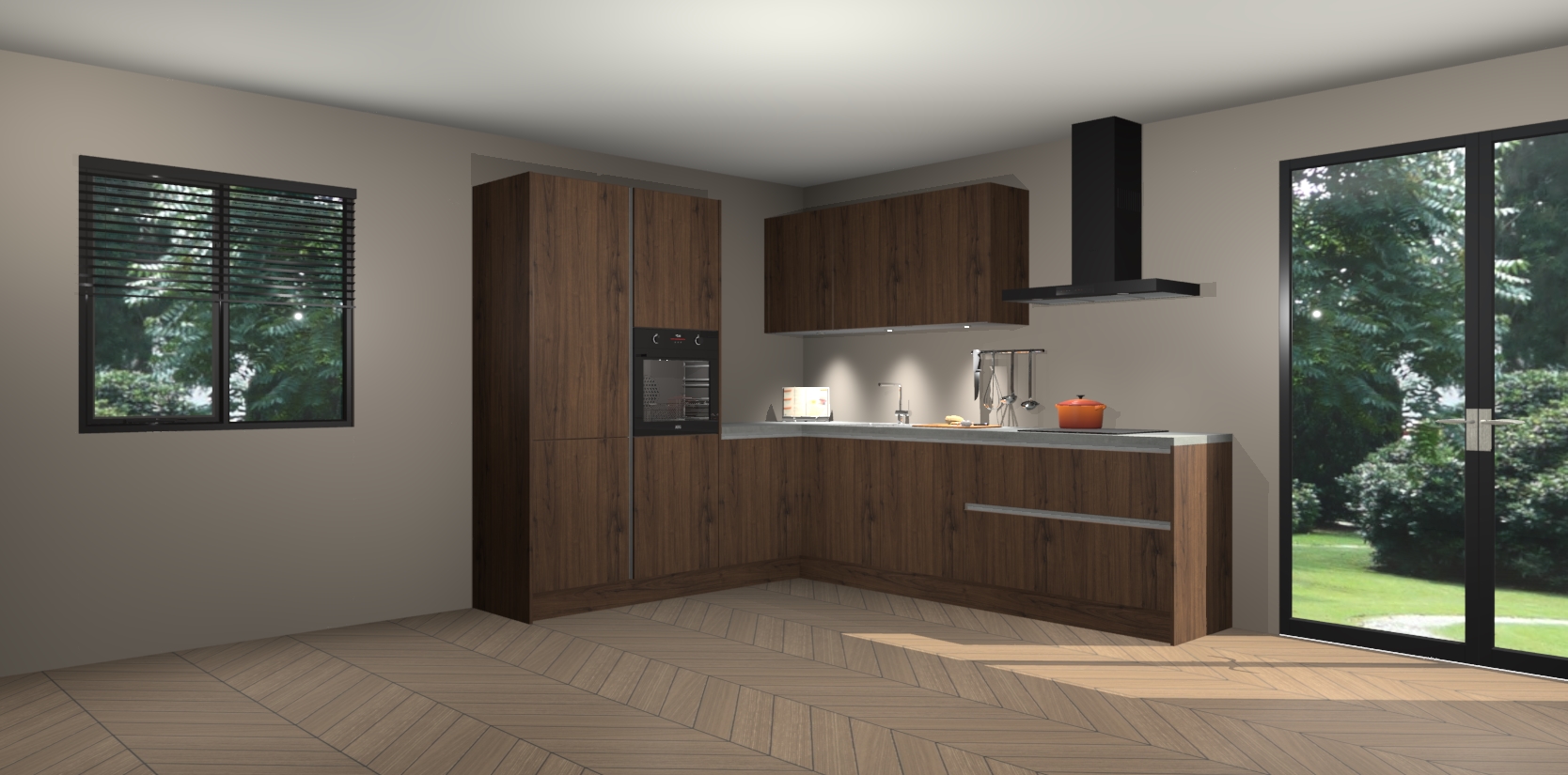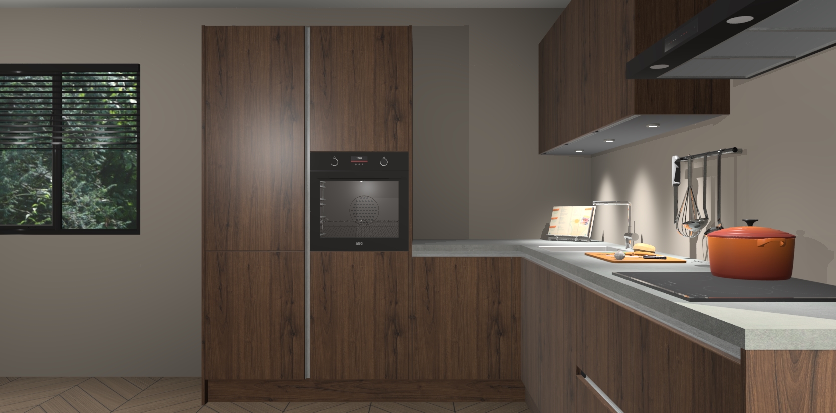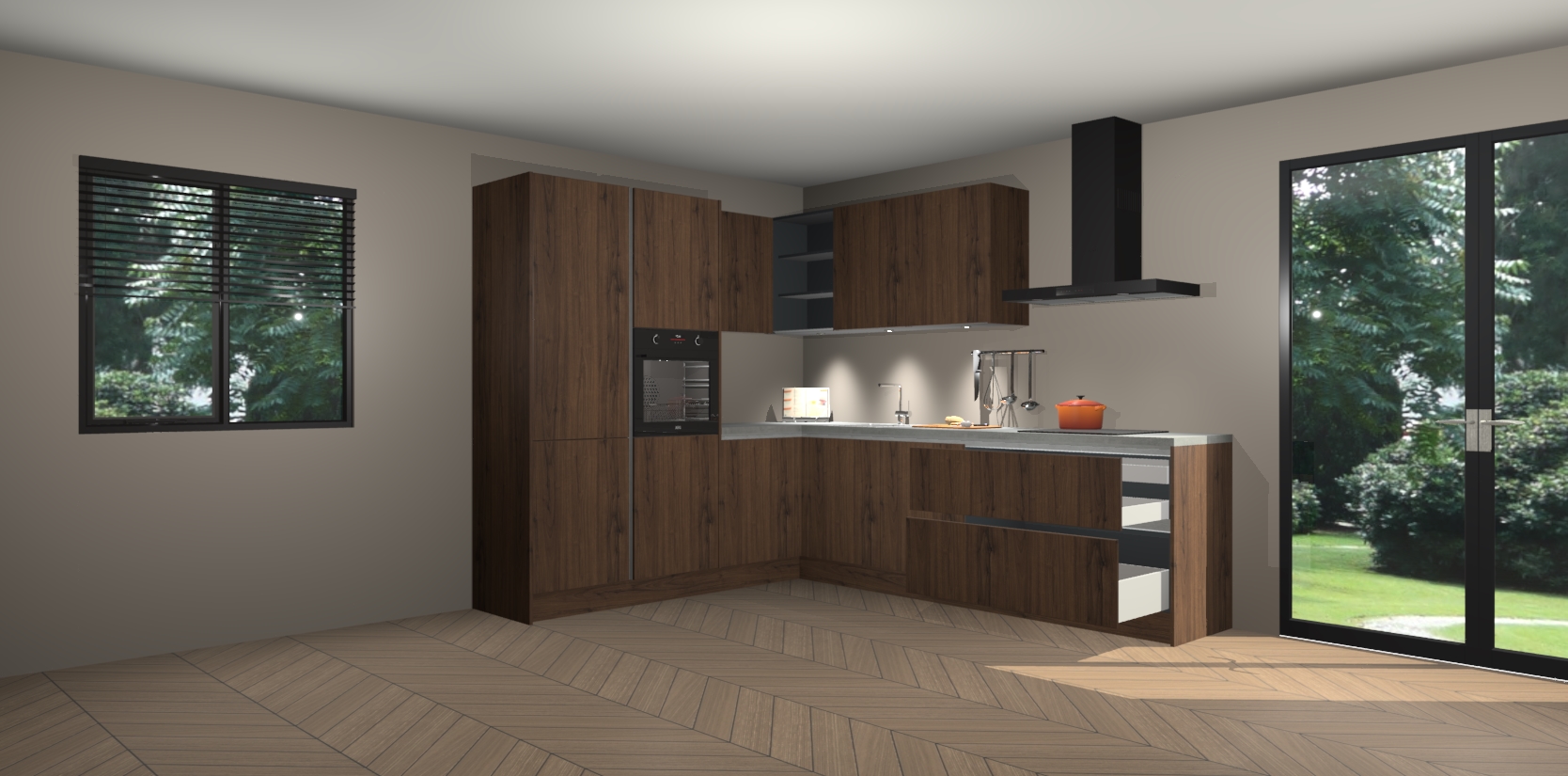 Maak kennis met de noten greeploze keuken Parla - de perfecte aanvulling voor uw moderne keuken! Ervaar tijdloos design, elegantie en een chique uitstraling met onze zwarte handgrepen, soft-close deuren en veel opbergruimte. Dit alles wordt aangeboden tegen een vaste lage prijs voor ongeëvenaarde Duitse keukenkwaliteit!
