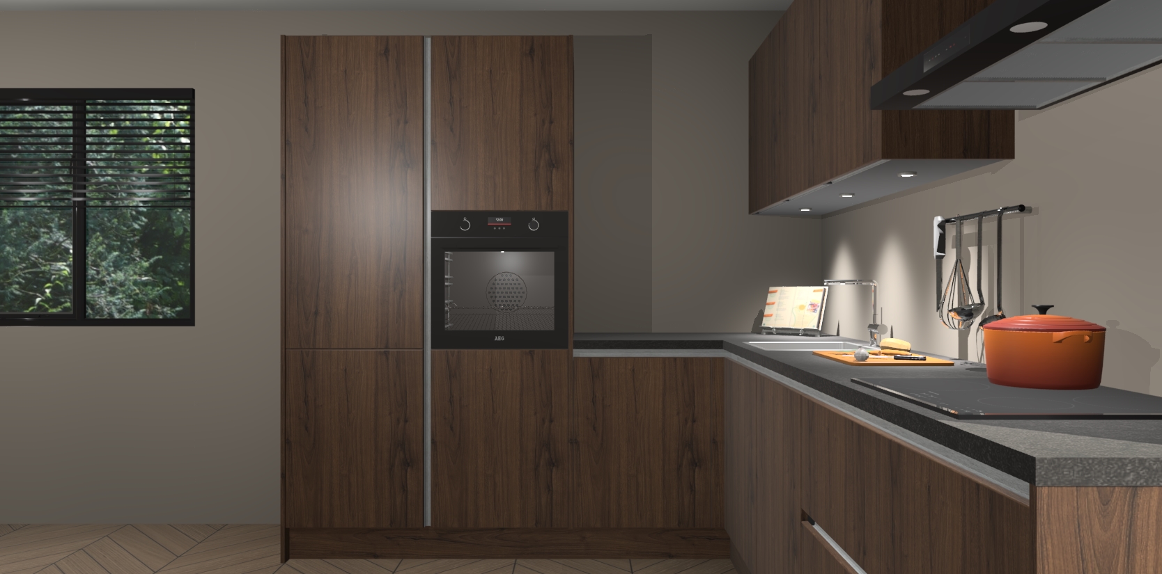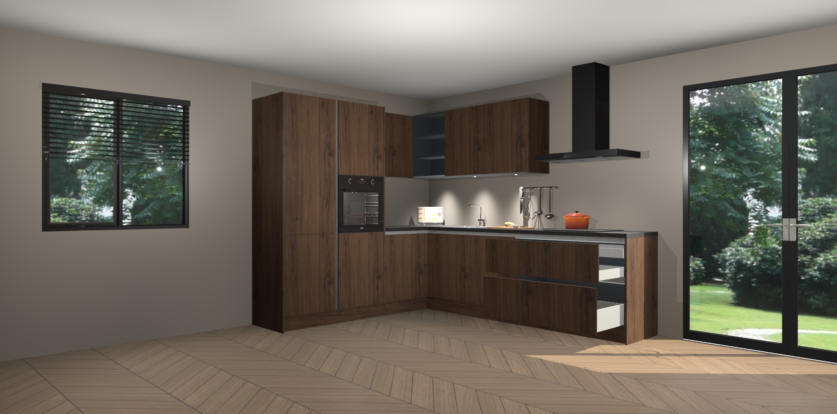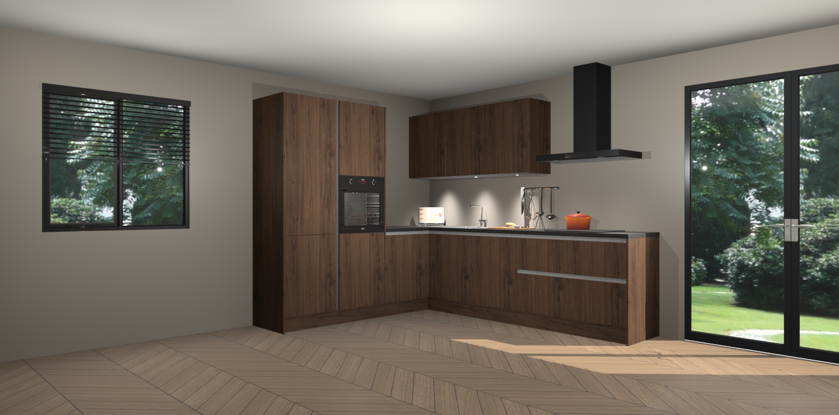 Maak kennis met de noten greeploze keuken Parla - de perfecte aanvulling voor uw moderne keuken! Ervaar tijdloos design, elegantie en een chique uitstraling met onze zwarte handgrepen, soft-close deuren en veel opbergruimte. Dit alles wordt aangeboden tegen een vaste lage prijs voor ongeëvenaarde Duitse keukenkwaliteit!
