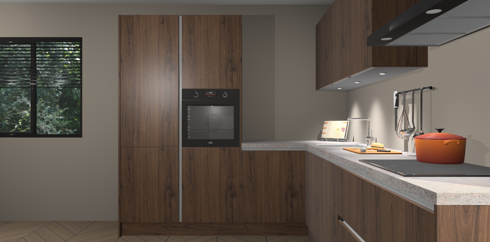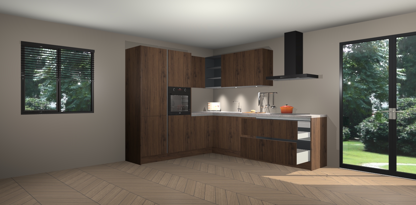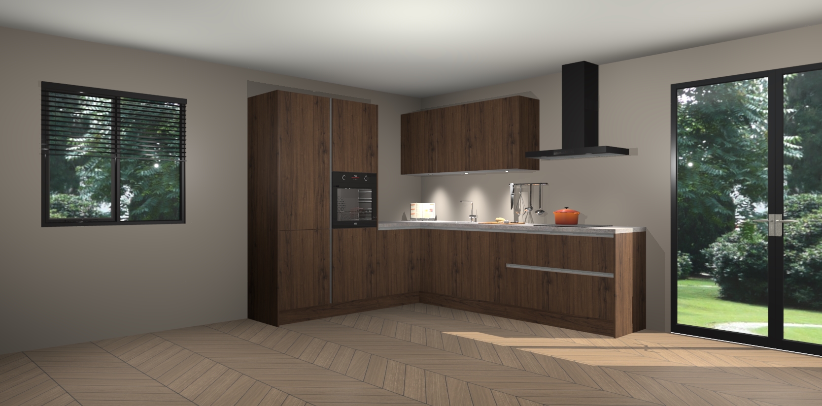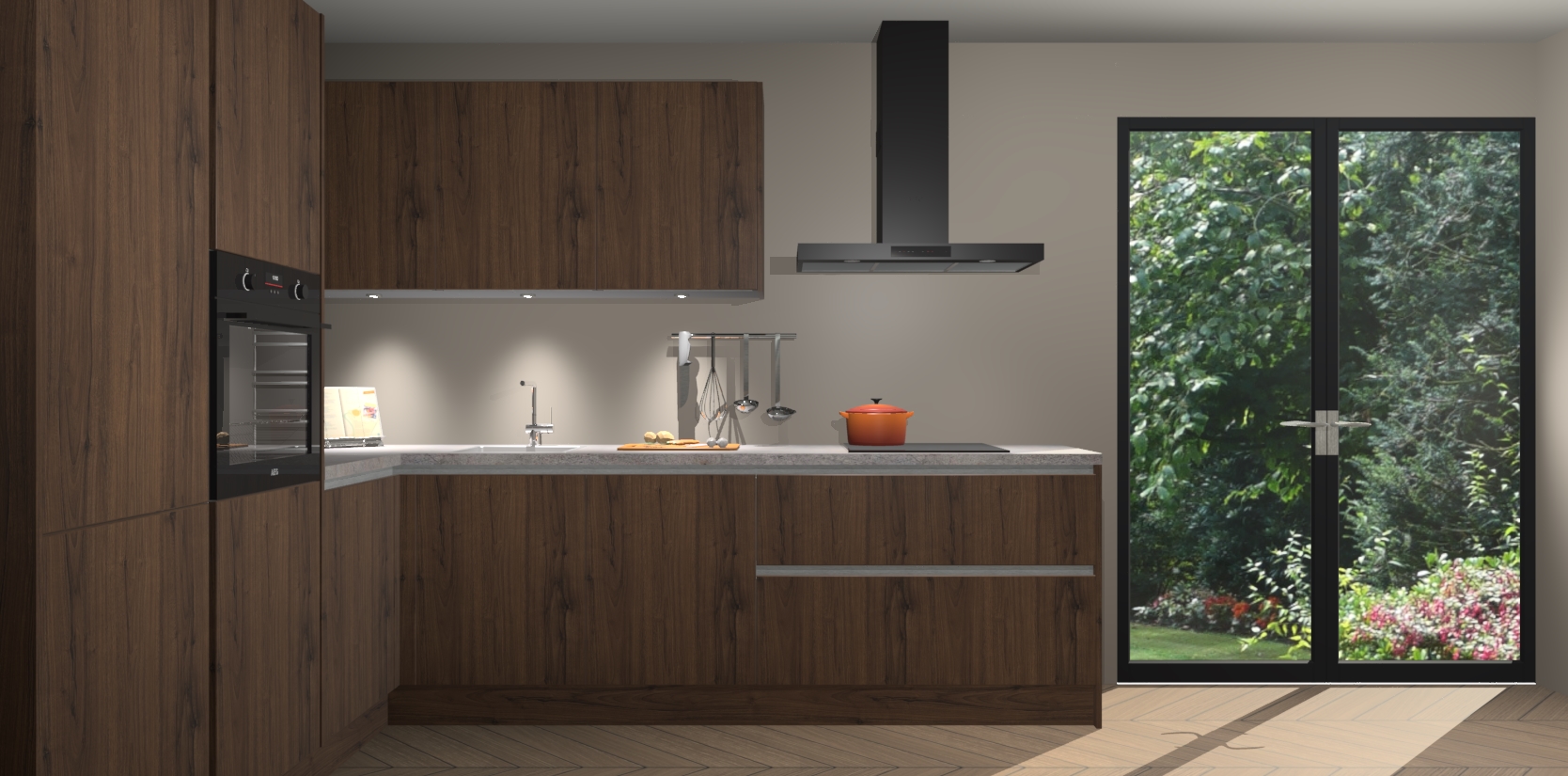 Maak kennis met de noten greeploze keuken Parla - de perfecte aanvulling voor uw moderne keuken! Ervaar tijdloos design, elegantie en een chique uitstraling met onze zwarte handgrepen, soft-close deuren en veel opbergruimte. Dit alles wordt aangeboden tegen een vaste lage prijs voor ongeëvenaarde Duitse keukenkwaliteit!