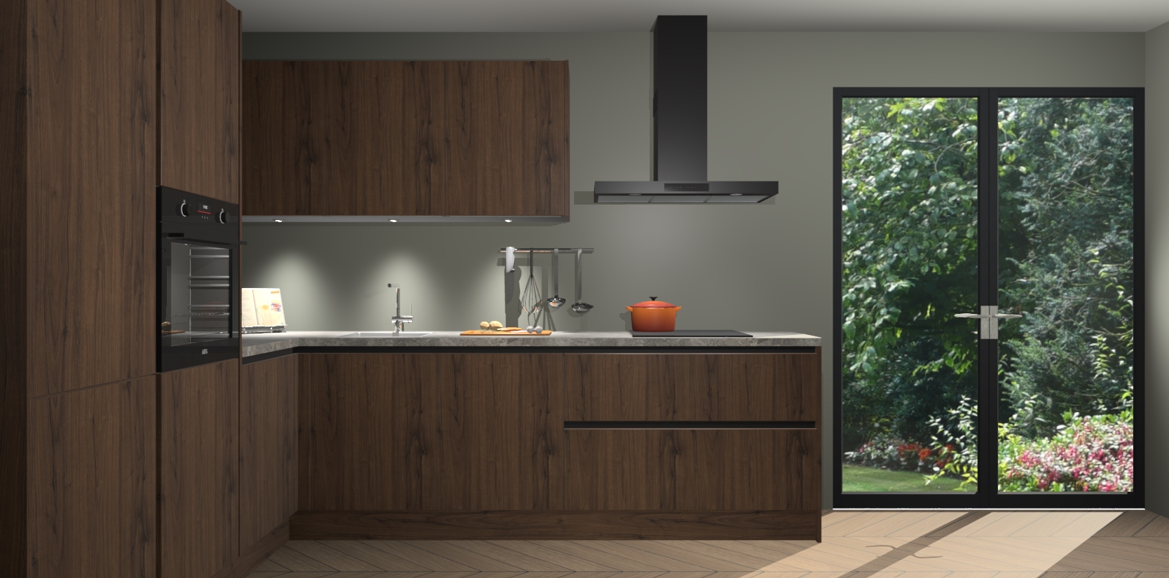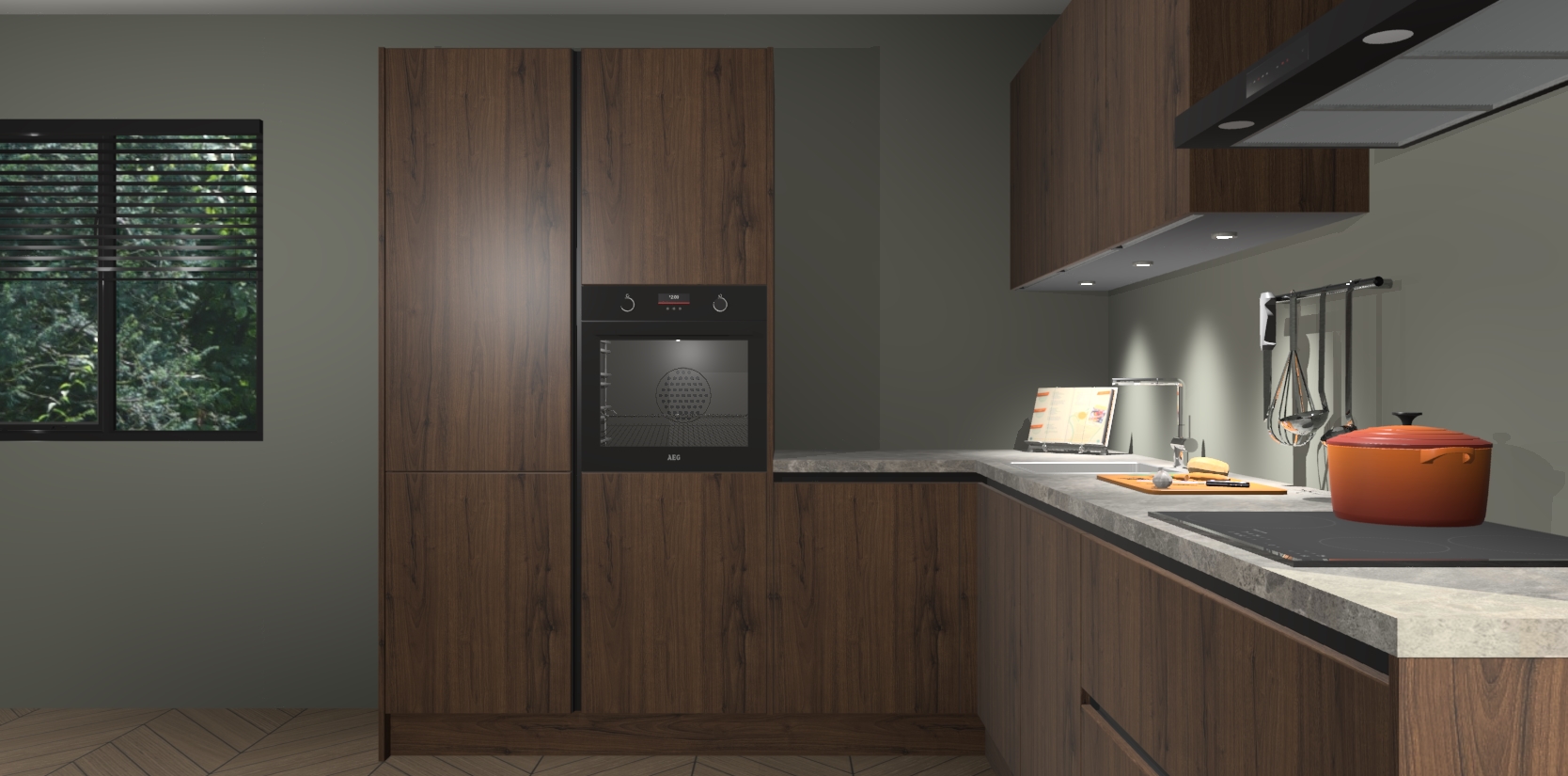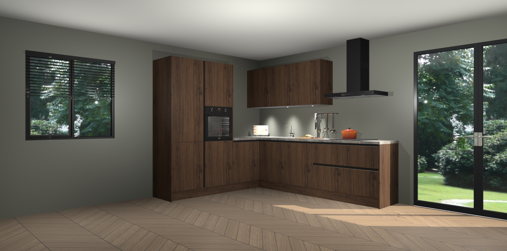 Maak kennis met de noten greeploze keuken Parla - de perfecte aanvulling voor uw moderne keuken! Ervaar tijdloos design, elegantie en een chique uitstraling met onze zwarte handgrepen, soft-close deuren en veel opbergruimte. Dit alles wordt aangeboden tegen een vaste lage prijs voor ongeëvenaarde Duitse keukenkwaliteit!